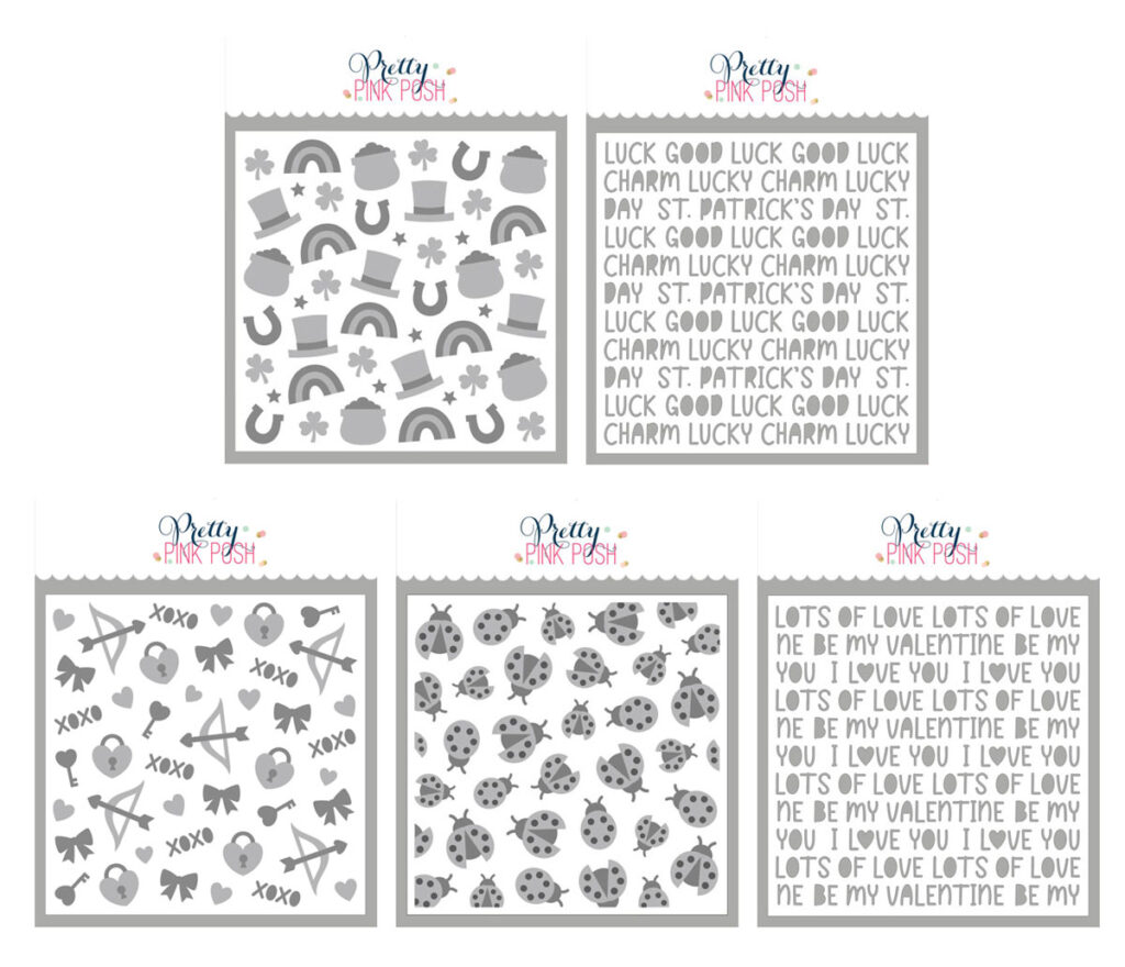 Here are the five new stencils for this month: Layered Lucky Items, Lucky Words, Layered Cupid Items, Layered Ladybugs, and Love Words.
