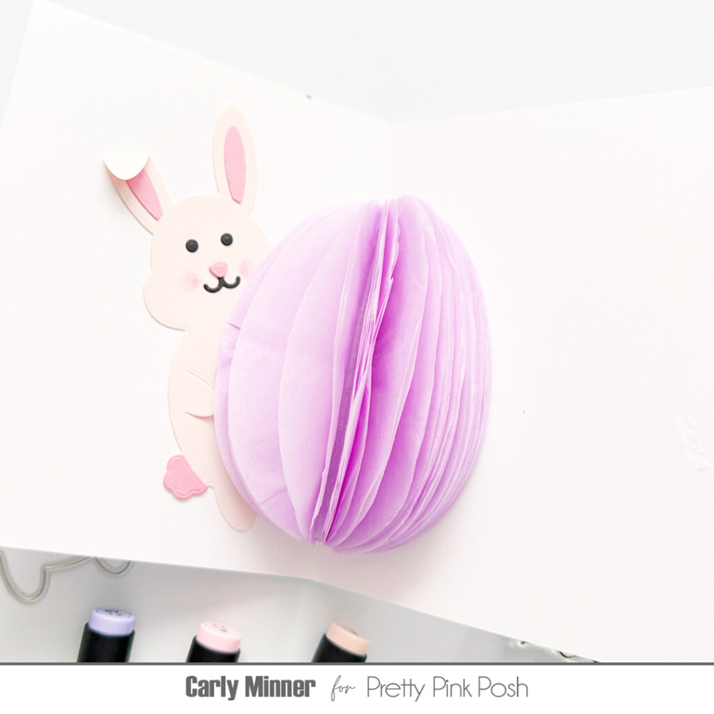 Next, I die-cut out some of the carrots, bow, eggs and Glitter marshmallows from the Easter Bunny Mug dies. With the Springtime Holder Additions Dies, I die-cut out some of the greenery and the smaller eggs. I started to tuck and pop up the die cuts all around her and placing a carrot in her paw. For a final touch I add one smallLilac Pearlto the center of the bow.