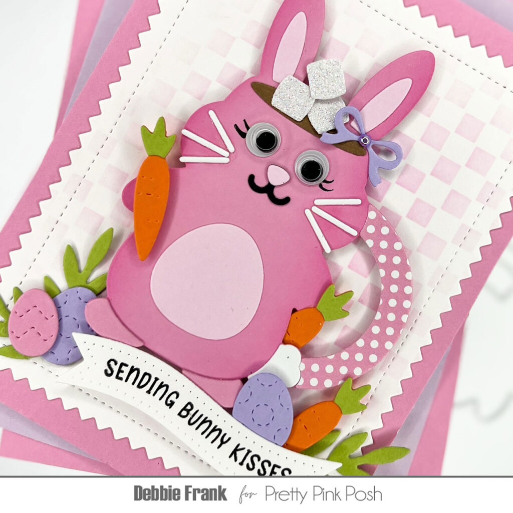 Little elements on the bunnies include glitter whiskers & cottontails, googly and onyx pearl eyes, blue polka dot eggs colored with alcohol markers, ink blended and die cut carrots, gingham pattern paper bellies, sparkly bow-ties and puffy pink cheeks using a cotton swap and Spun Sugar Distress Oxide Ink.