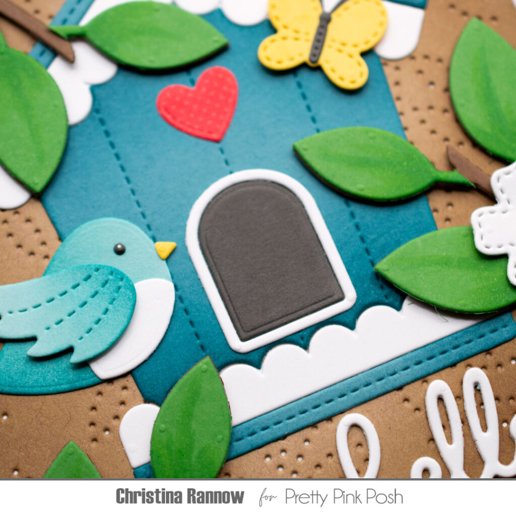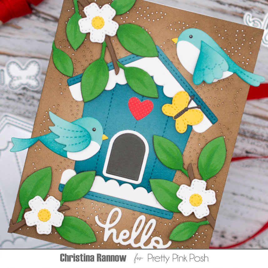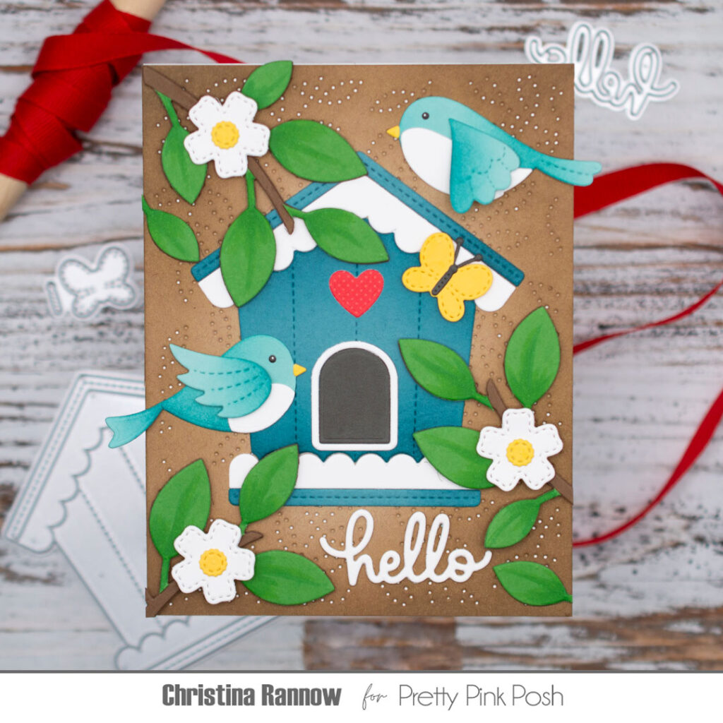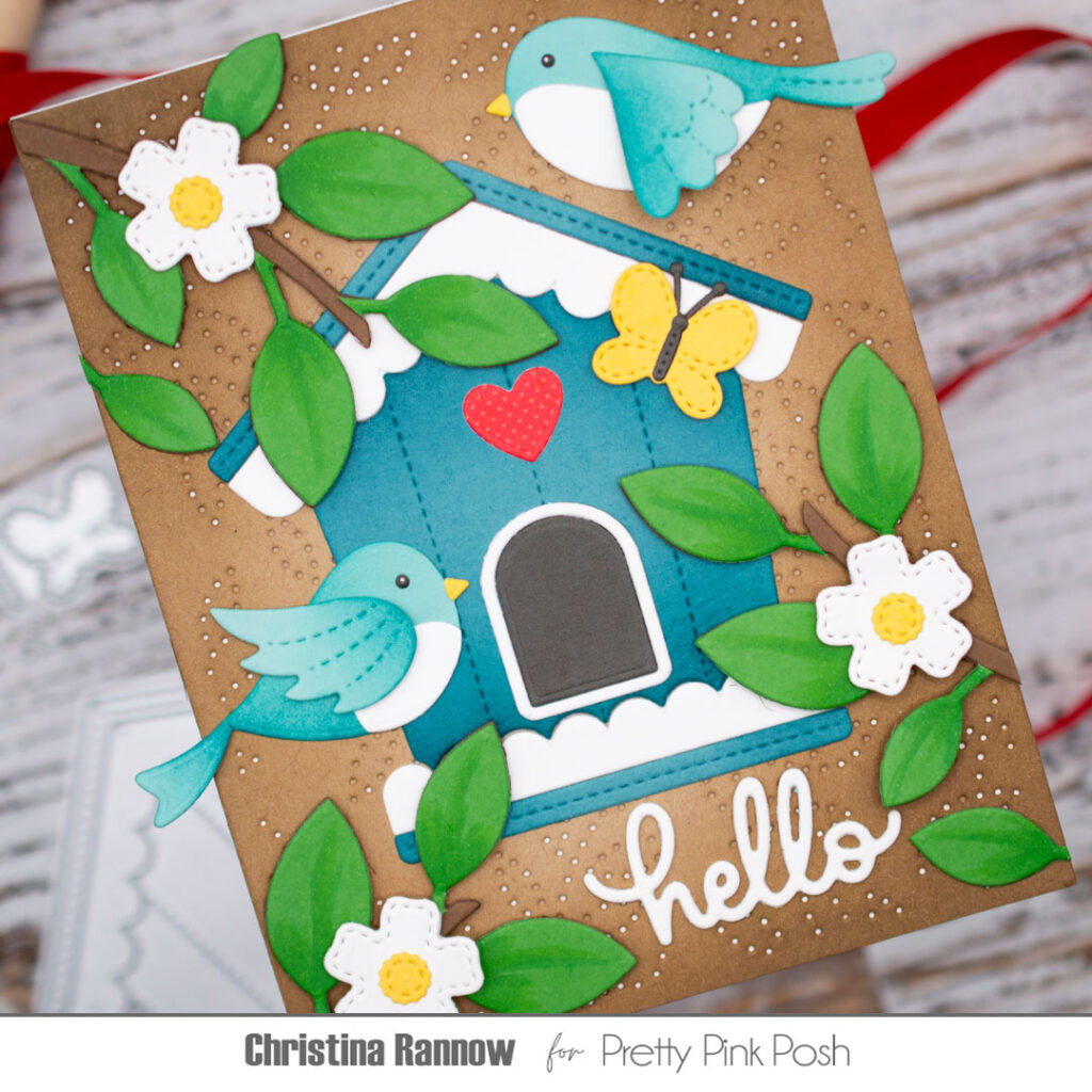 Hi again, friends! Christina here, and I’m so excited to share with you this cute woodland scene featuring the Decorative Birdhouses Dies and the Stitched Birds Dies. I nestled the birdhouse in plenty of green leaves on a Pierced Leafy Vinesbackground to create a treetop getaway for a pair of the sweetest little birds. Take a quick peek at my supplies and then we’ll get started.