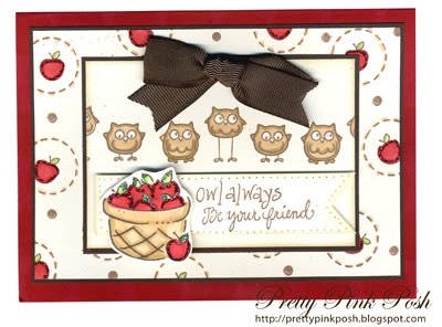 Today we’re featuring the new Apples & Pears. Who knew that fruit could make a person so happy? I have created many, many cards with these images, but I can’t reveal them all yet. ;) For this card I wanted to bring together the apples with the owls. Owls have been quite popular in the stamping world, but I never got into them because I didn’t find any I liked. Boy was I excited when I saw these little guys! They are so adorable and whimsical!
