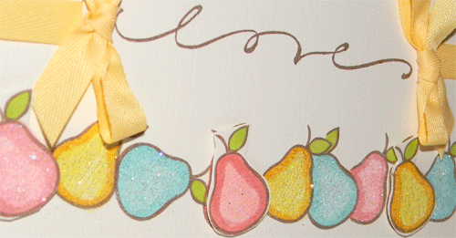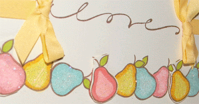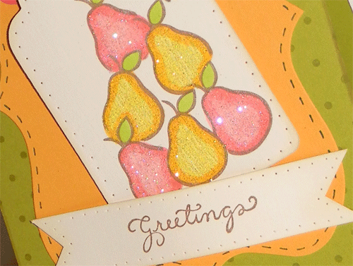 I simply adore these color together; it’s so fresh and well, yummy! I used my favorite Tim Holtz die and added some faux stitching. Alas, I still can’t do real stitching on cards; I need someone to come teach me. Anyhow, back to the card…. I created a tag with my Cricut and made a pile of pears. After coloring them, I added some Citrone glitter (LOVE) and Strawberry Freeze glitter