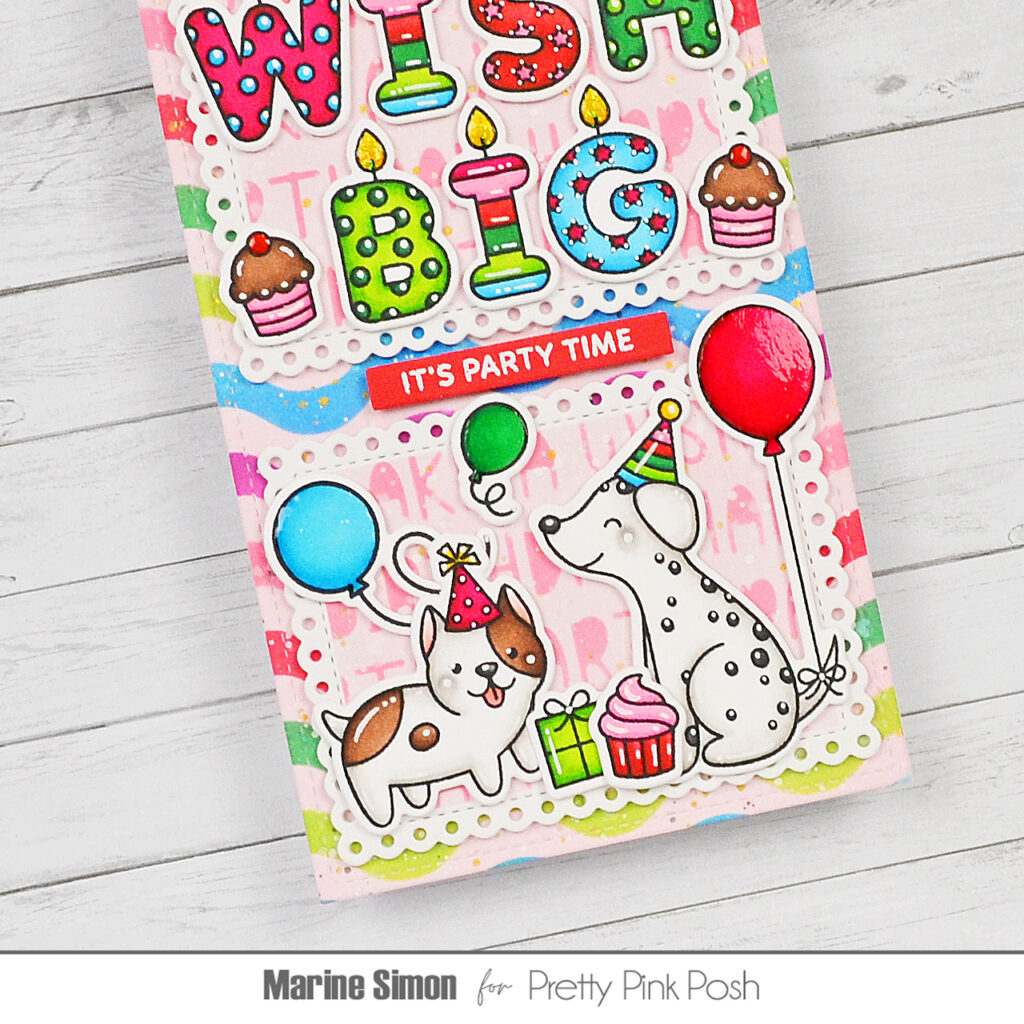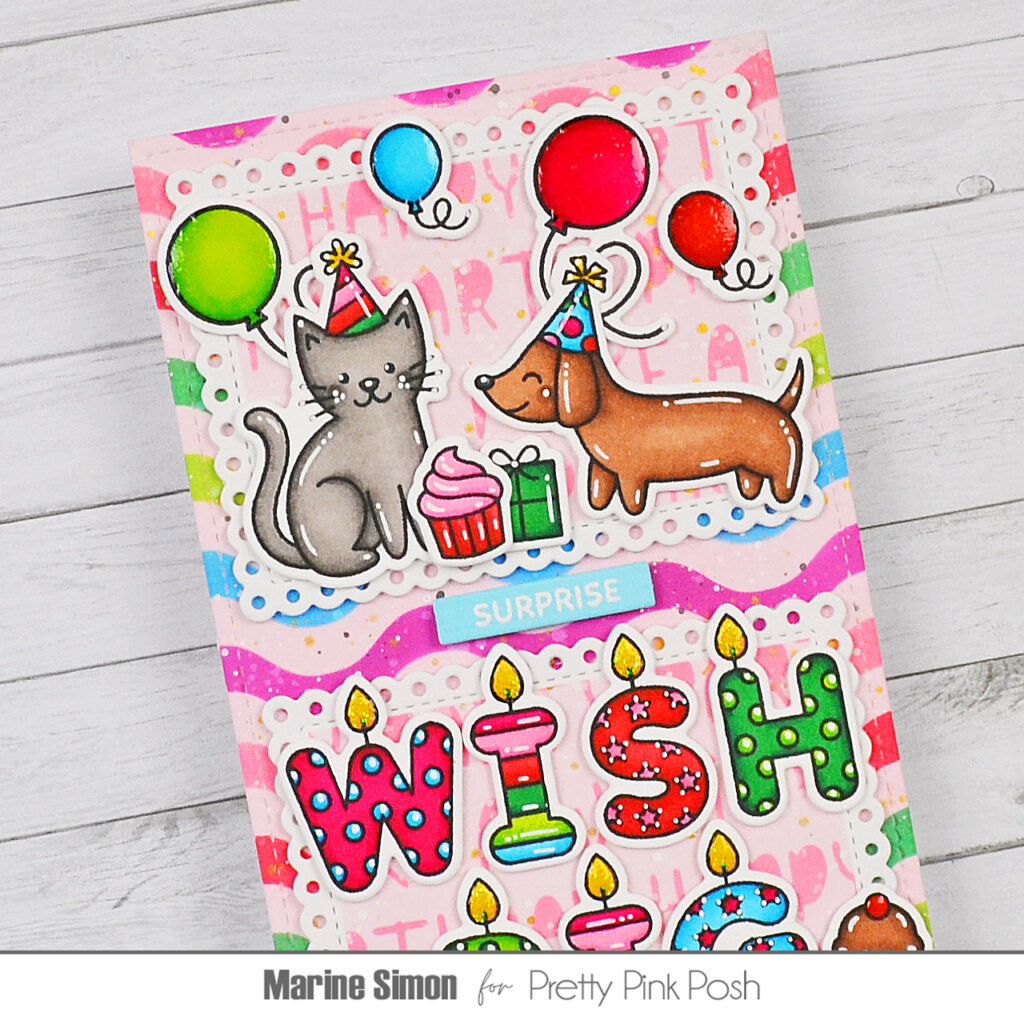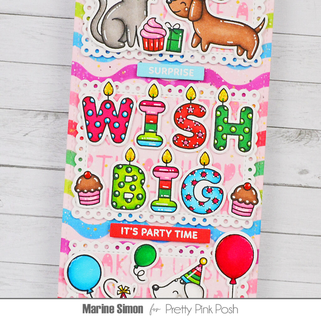 Before attaching everything to my Wavy Stripes panel, I white heat embossed “Surprise” from Birthday Dogs & Cats on blue cardstock, “It’s party time” from Sentiment Strips Birthday on red cardstock, and I trimmed both sentiments using a Sentiment Strips die. And then I stuck everything to my slimline panel, starting with the three Eyelet Rectangles using 1mm foam tape, and then the images and sentiment banners using 1mm and 2mm foam squares.