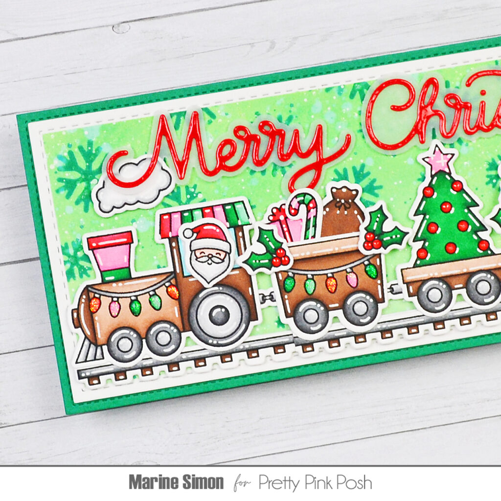 For my greeting, I used the Merry Christmas Shadow dies. I cut the word pieces out of red cardstock and the shadow pieces out of vellum, stuck each red word to its matching shadow using liquid glue, and then attached the entire greeting above the train using slim pieces of 1mm foam squares. As for the final details, I applied glossy accents to my red “Merry Christmas”, to the holly berries and to the lights in the Christmas tree, and then white blizzard nuvo drops to the lights on the locomotive and wagons.