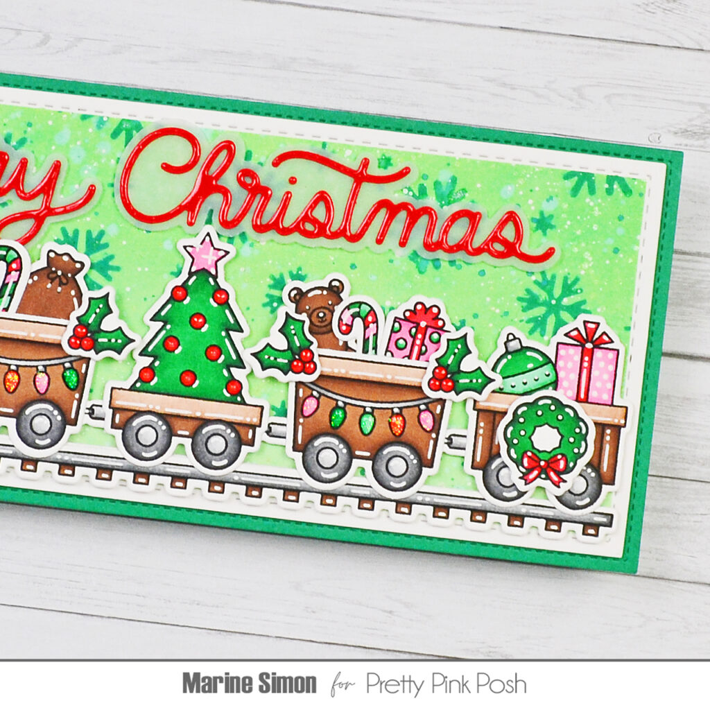 Hello crafty friends, Marine here, I’m so happy to be back with this lovely Christmas card showcasing the Christmas Train from the September 2025 release. Except for the Valentine Train card I made back in January 2024, I like to use a slimline panel to feature as many wagons as possible, and for today’s card I knew since the beginning that I wanted to use the Merry Christmas Shadow dies, so I definitely needed a slimline design to feature this big sentiment right above my cute Christmas Train.