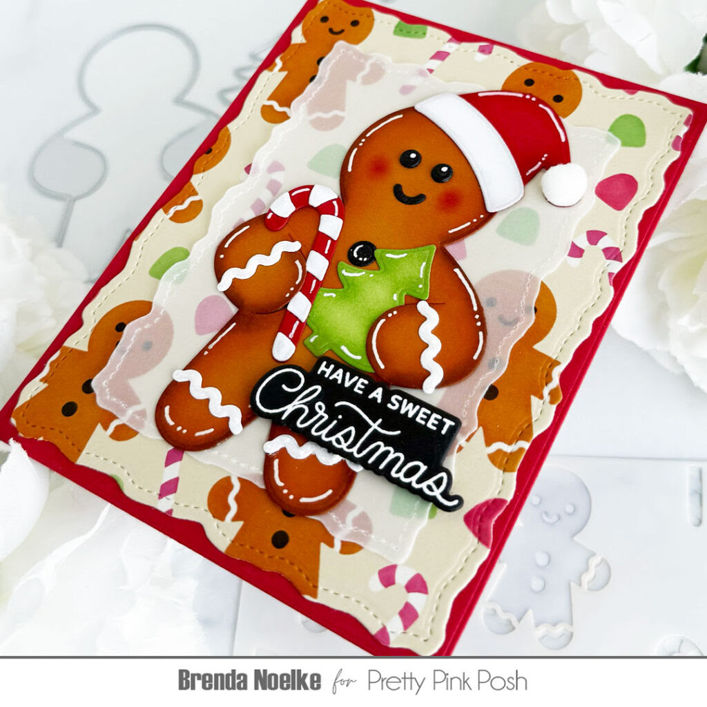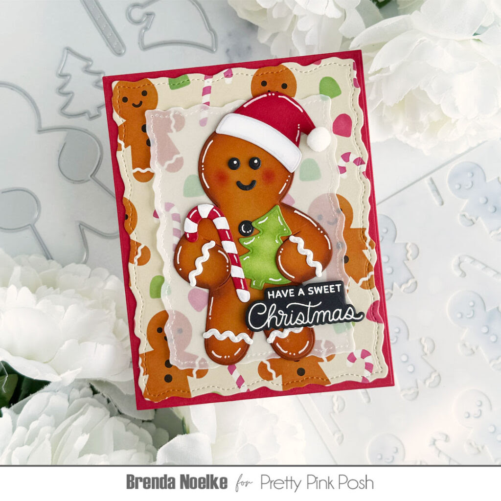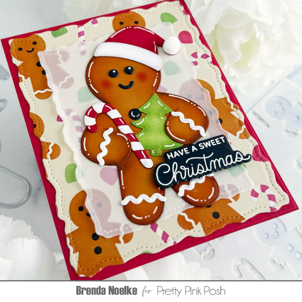 The Gingerbread Holder Dies were cut from brown, red, black and white cardstock. The candy cane and tree are from the Christmas Holder Additions Die Set. They were cut from red, white and green cardstock. I added a bit of shading to the die-cuts with dye inks and blending brushes, then arranged and adhered them all together with liquid glue. The second largest die in the Stitched Torn Rectangles die set was cut from vellum. The gingerbread man was adhered to the vellum with liquid glue, then the vellum was adhered to the background, adding adhesive only behind the die-cuts.