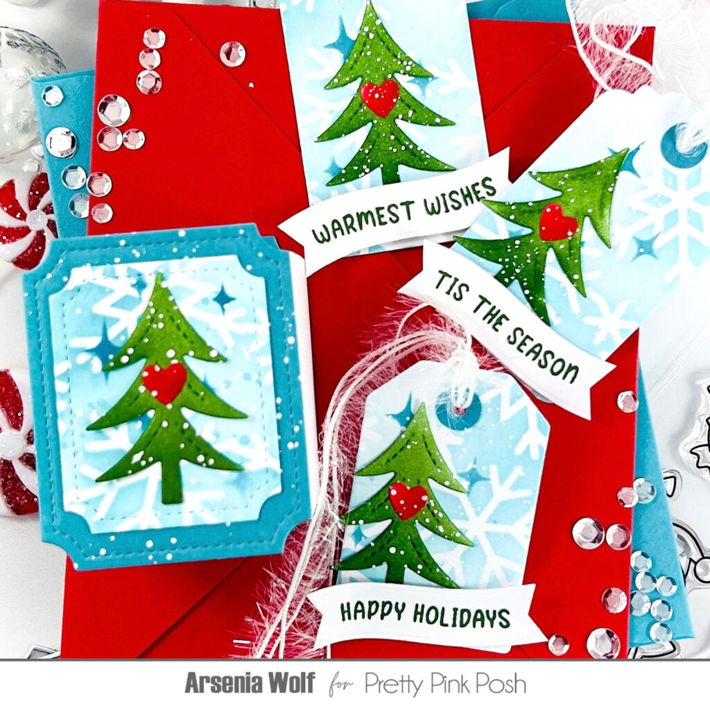A dainty bow (from the beloved Beautiful Bows Die Set) and a sprinkle of hearts from Build a Heart dies brought everything together. And because it wouldn’t be a proper winter card without it — I added white splatters for that freshly fallen snow look. Ta-da! You’d think tags belong on gifts, but oh no — they make stunning cards too!