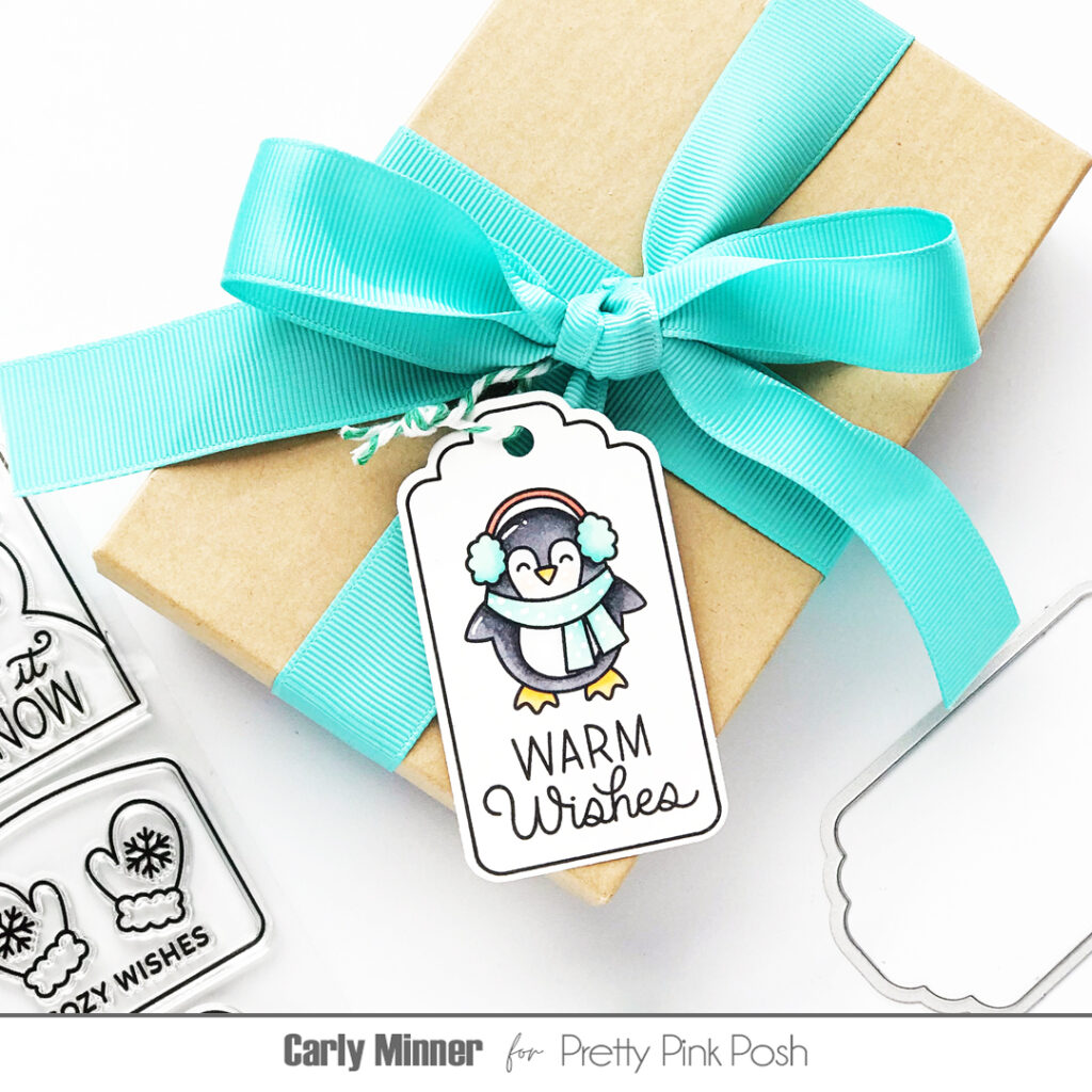 For my final trio of tags using the Notched Rectangles Dies as tags, I switched things up — one with a snowy tree from Winter Trees Die set, one featuring our darling penguin friend from Penguin Friends Stamp set, and one with a shimmering snowflake from the Stitched Snowflake Dies.