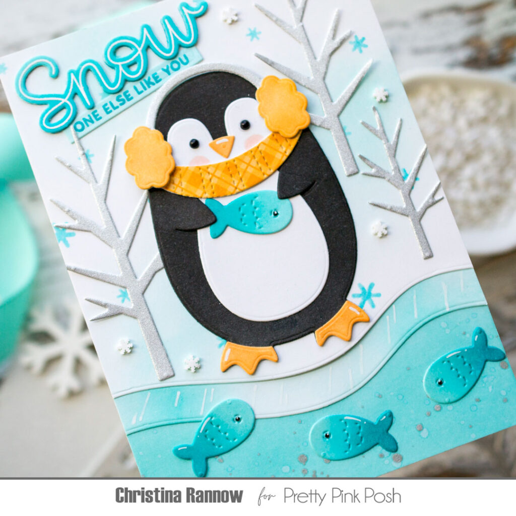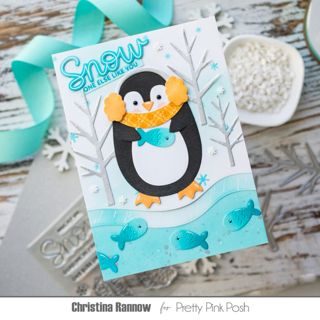 To finish things up, I die-cut multiple fish from the Cat Holder die set and ink blended them with two icy blue colors before adding eyes with a black glaze pen and highlights with a white gel pen. I gave one to the penguin to hold and added the rest to the icy waters. Then I added a sentiment from the new Let it Snow stamp set that has coordinating dies and, lastly, added a flurry of white clay snowflakes from the Winter Wonderland Mix.