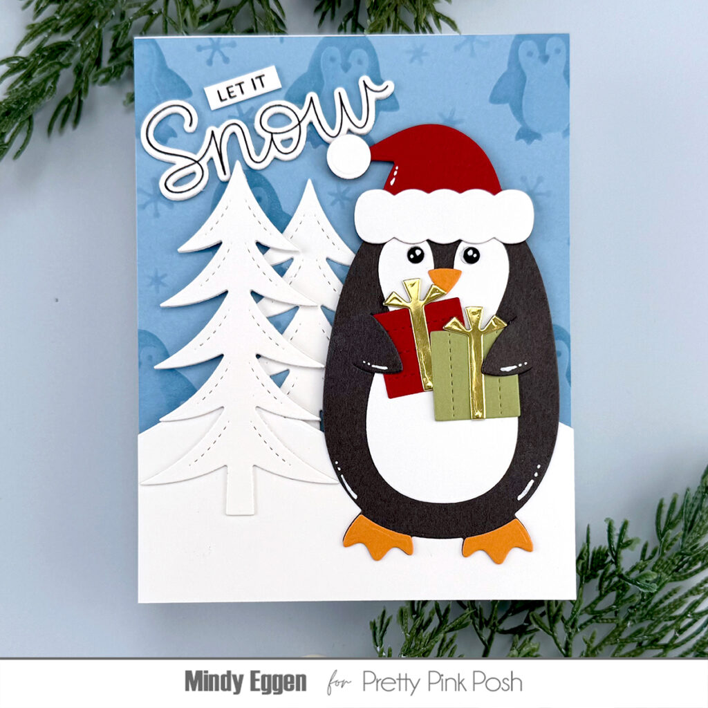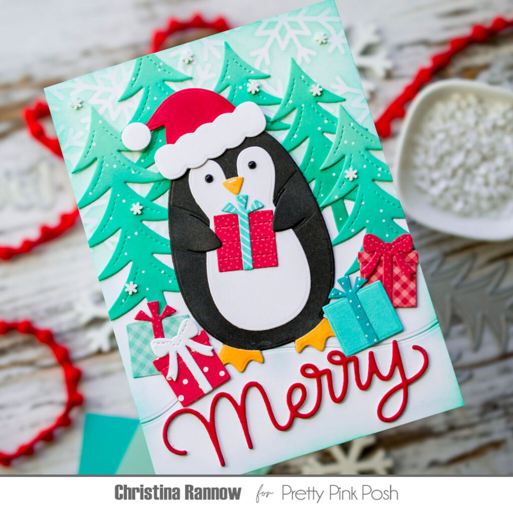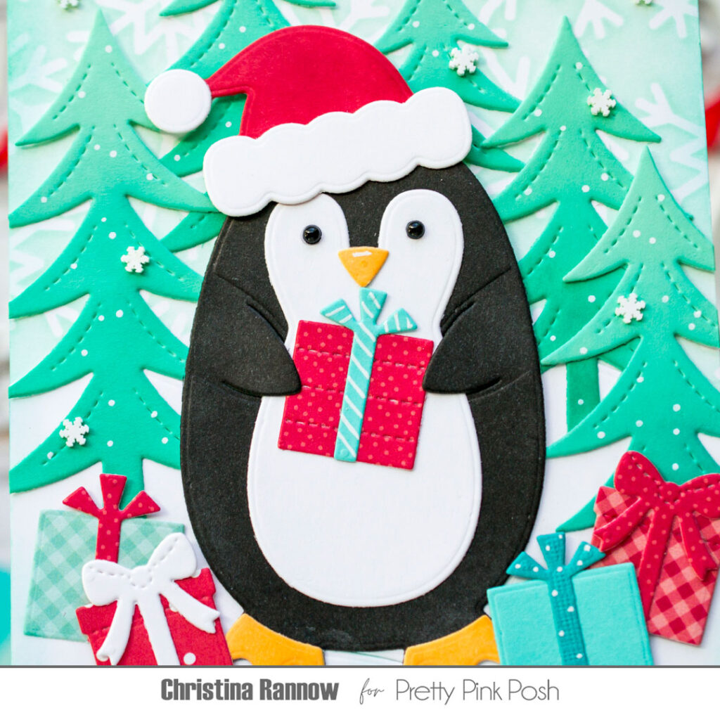 Hello, friends! Christina here to share some snowy sneak peeks of the upcoming winter release. For inspiration, I created a couple of bigger A6 cards featuring the adorable new Penguin Holder. This frosty friend is the latest addition to the popular critter holder collection and can hold any of the winter- or Christmas-themed accessories for creating festive wintertime cards! Let’s get started!
