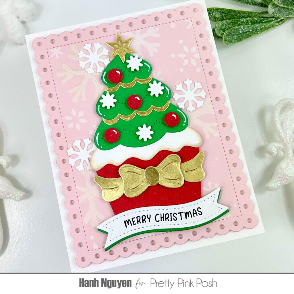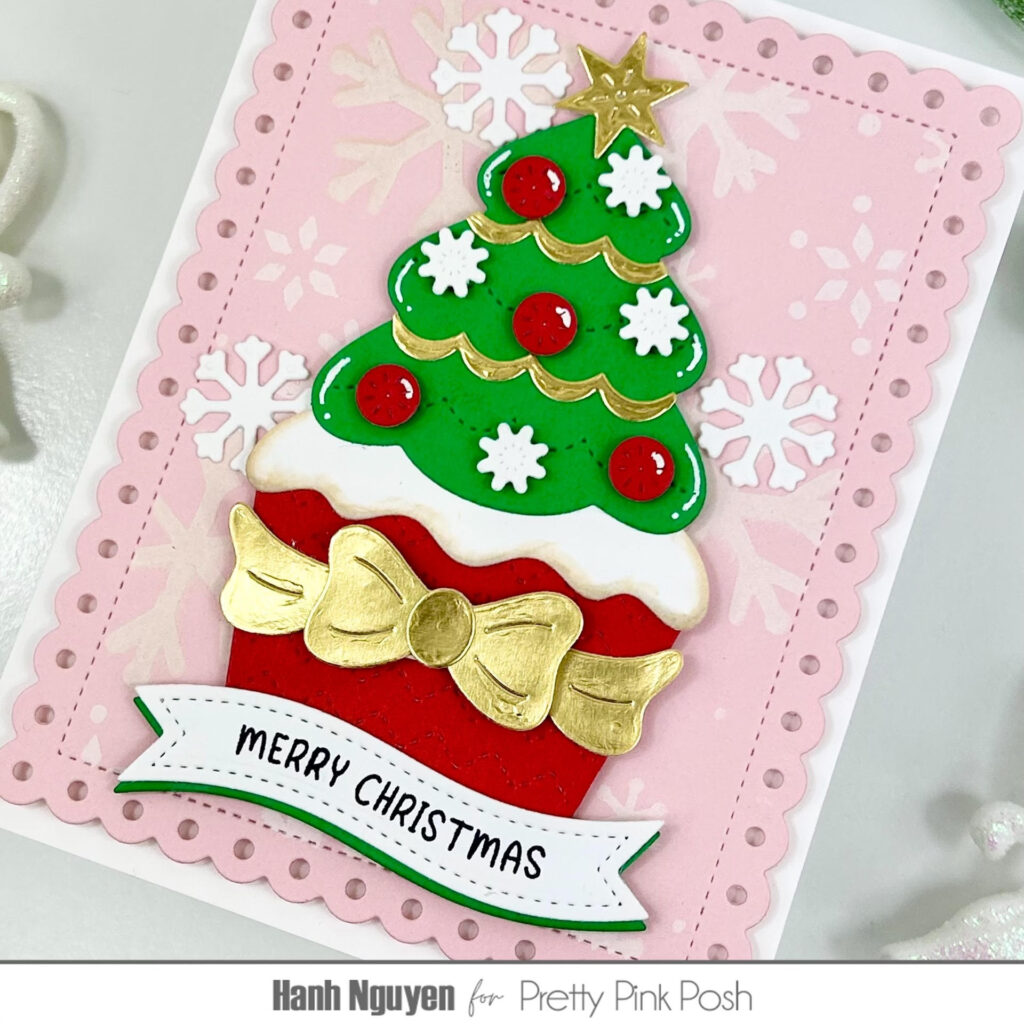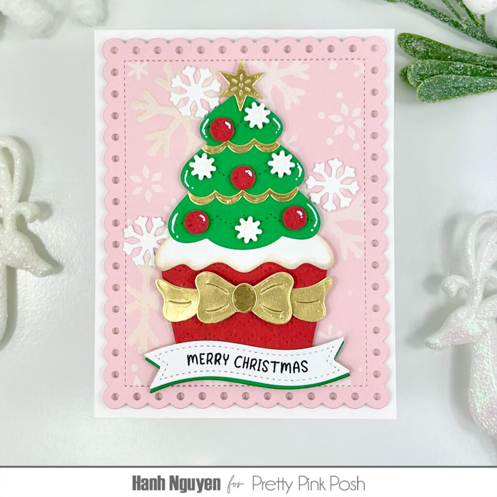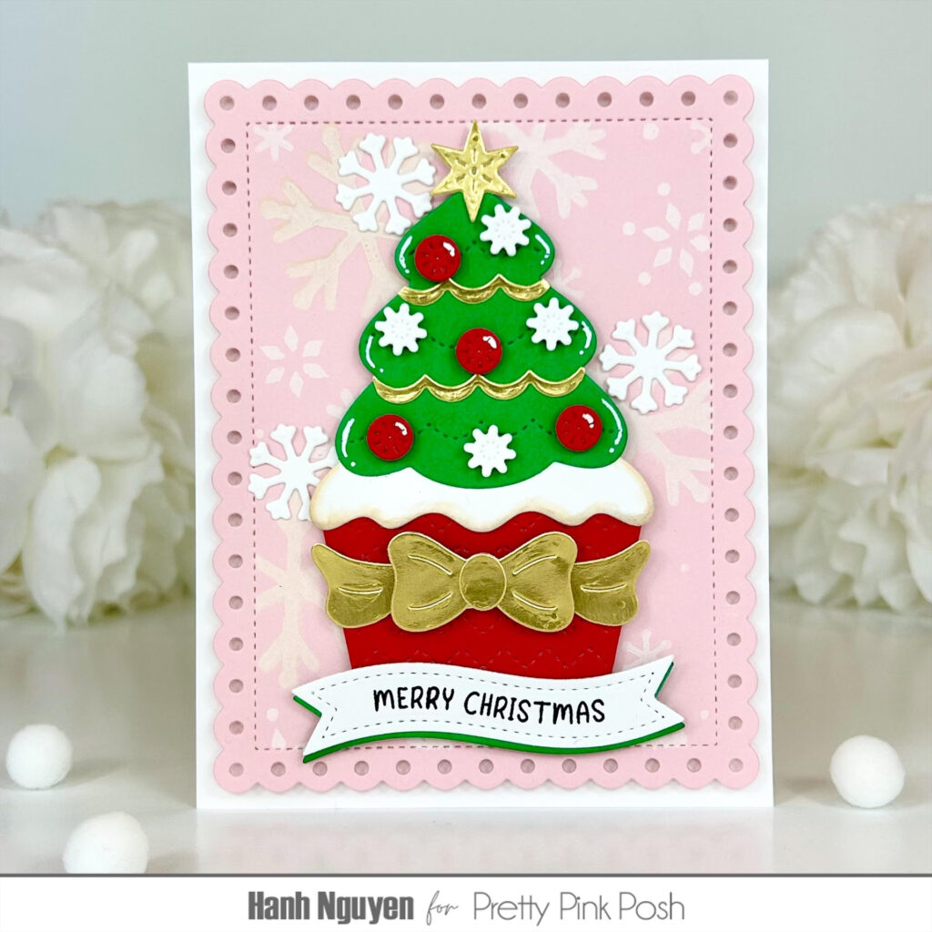 Hello Crafty Friends! It is Hanh here with you today. I’m sharing a fun and yummy Christmas card featuring the Big Christmas Cupcake Dies. Can you imagine if this were a real cupcake? Wouldn’t that huge Christmas tree worth of frosting be just heavenly?! It’s making me hungry already. This was a super fun die to play with because the possibilities for decorating this cupcake are endless.