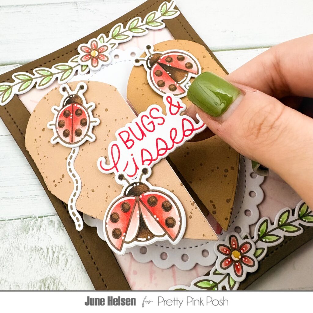 To decorate my heart card, I added ladybugs and trails from the Lovely Ladybugs set and also used the ‘Bugs and Kisses’ sentiment that’s included to create a little tab to grab onto. I sprinkled some flowers from the Friend Greetings stamp set around the card as well. I stamped all of the images in brown ink (except for the sentiment) so it would look a bit softer. I positioned them on the inside in a way that would leave a bit of room to write a message.