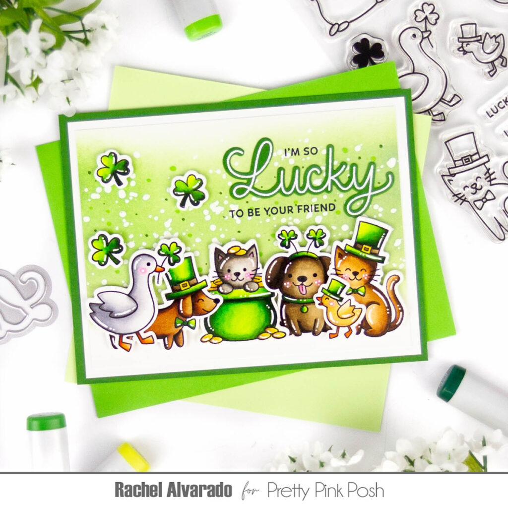 I absolutely love this set! It’s filled with so many cute critters that pair well with many of the products from the new release. I paired this set with the Lucky to Know You Stamp Set and Lucky to Know You Coordinating Dies.