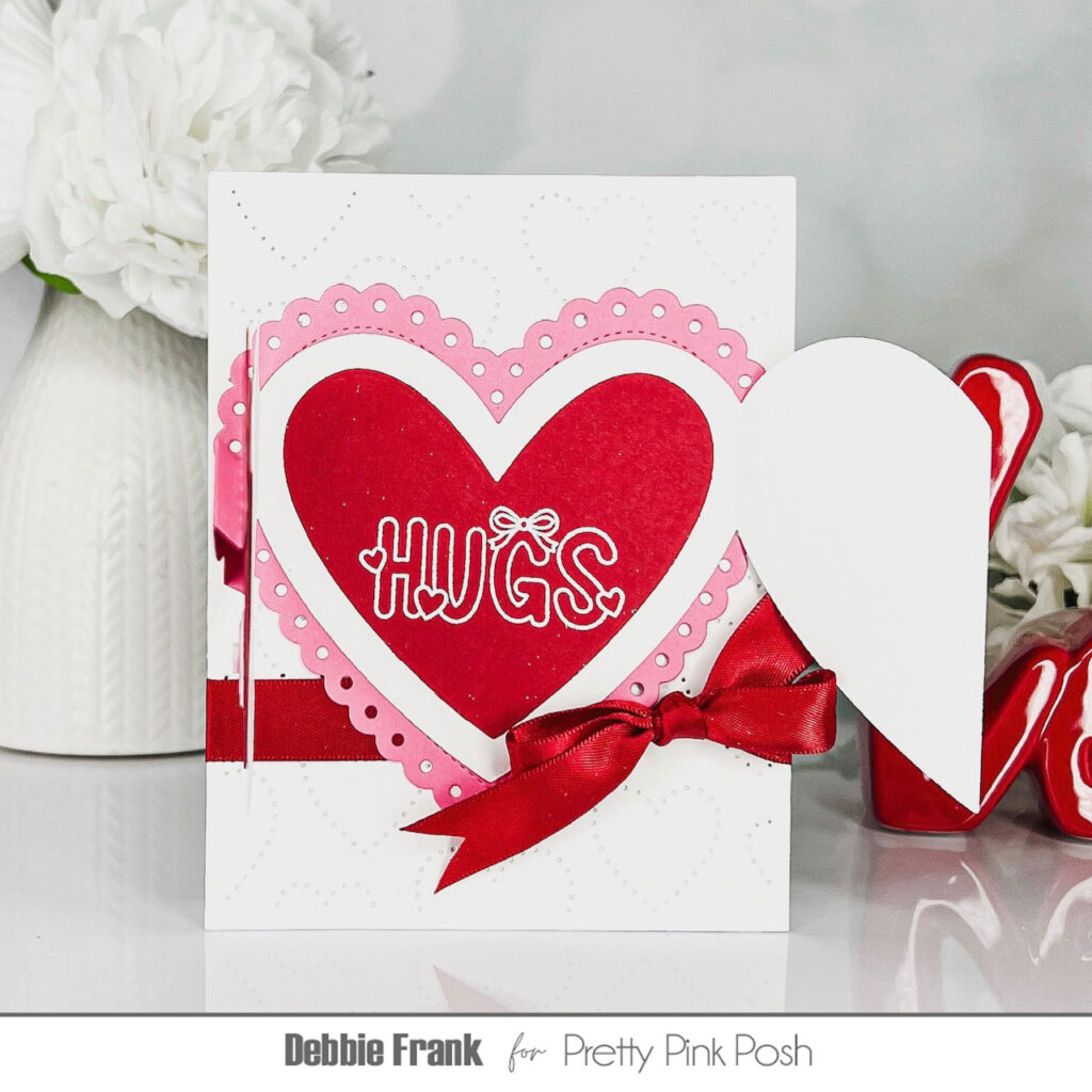 I then die-cut another inner heart die piece to attach on the inside of the card base for my sentiment. But first with the Valentine Word Scene stamp set I stamped and white heat embossed the “HUGS” and attached to the inside of the Heart Card Base.