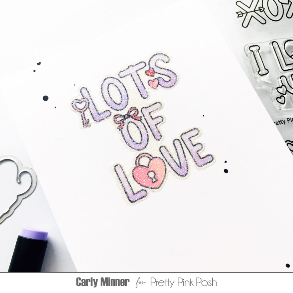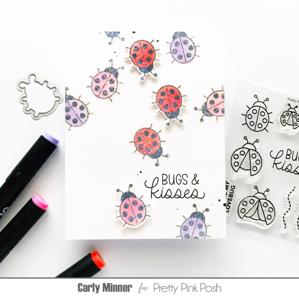 Glitter, double-sided sheets of adhesive and dies come together to create really fun & sparkly stickers. After stamping & coloring an image, I use the coordinating die to cut the shape from double-sided adhesive. I remove one side of the liner paper and place adhesive over the image. Then I remove the top liner paper and add glitter. I think this technique looks so super cute with the new Lovely Ladybugs!