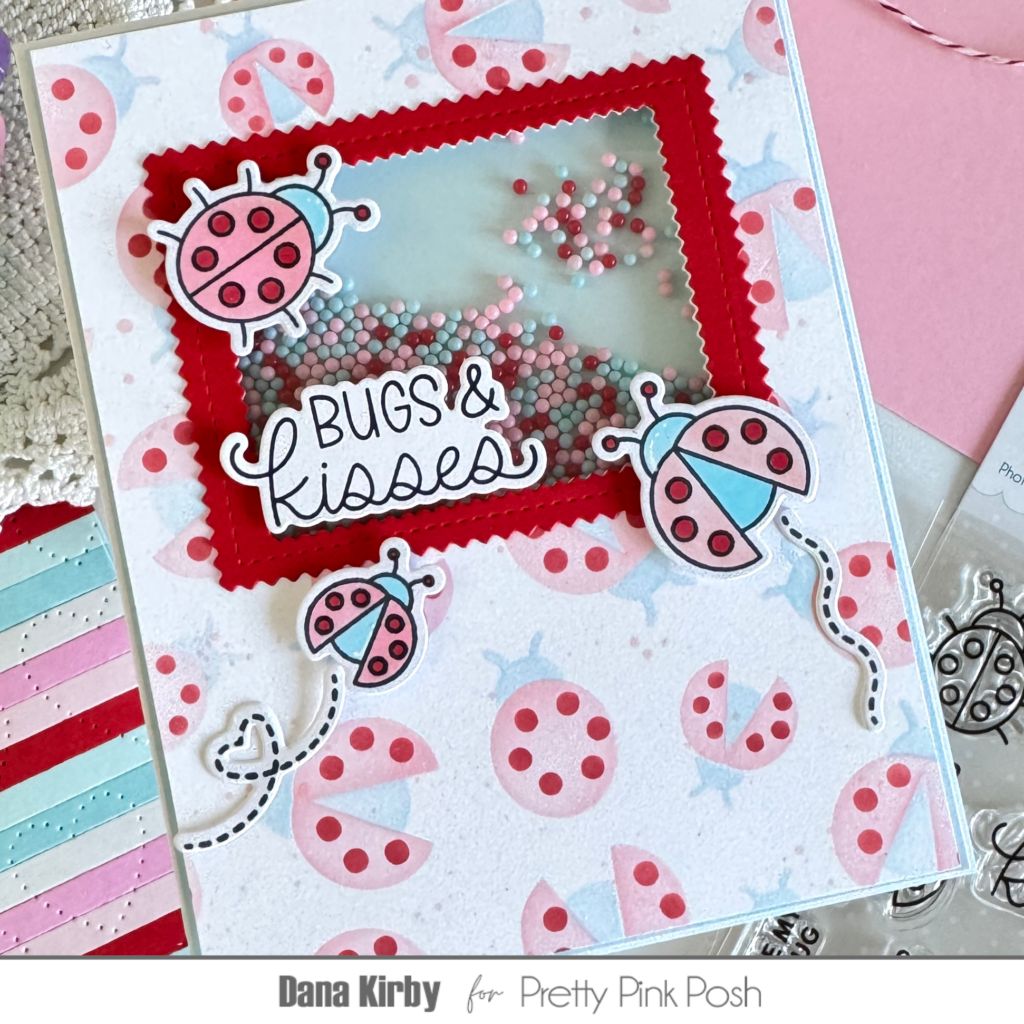 I started my card by making my card panel with the Layered Ladybugs stencil set. I ink blended the layers with pink, a soft blue and red ink. When the panel was finished I added a few splatters with a coordinating pink reinker. Next, I used the Pinking Rectangle dies to cut an opening in my panel and to die cut a red frame. I then attached acetate and foam adhesive to the back of the opening and filled it with Love Is Kind shaker beads. Lastly, I attached a blue mat to the back of my panel and added my red frame around the opening to finish my panel.