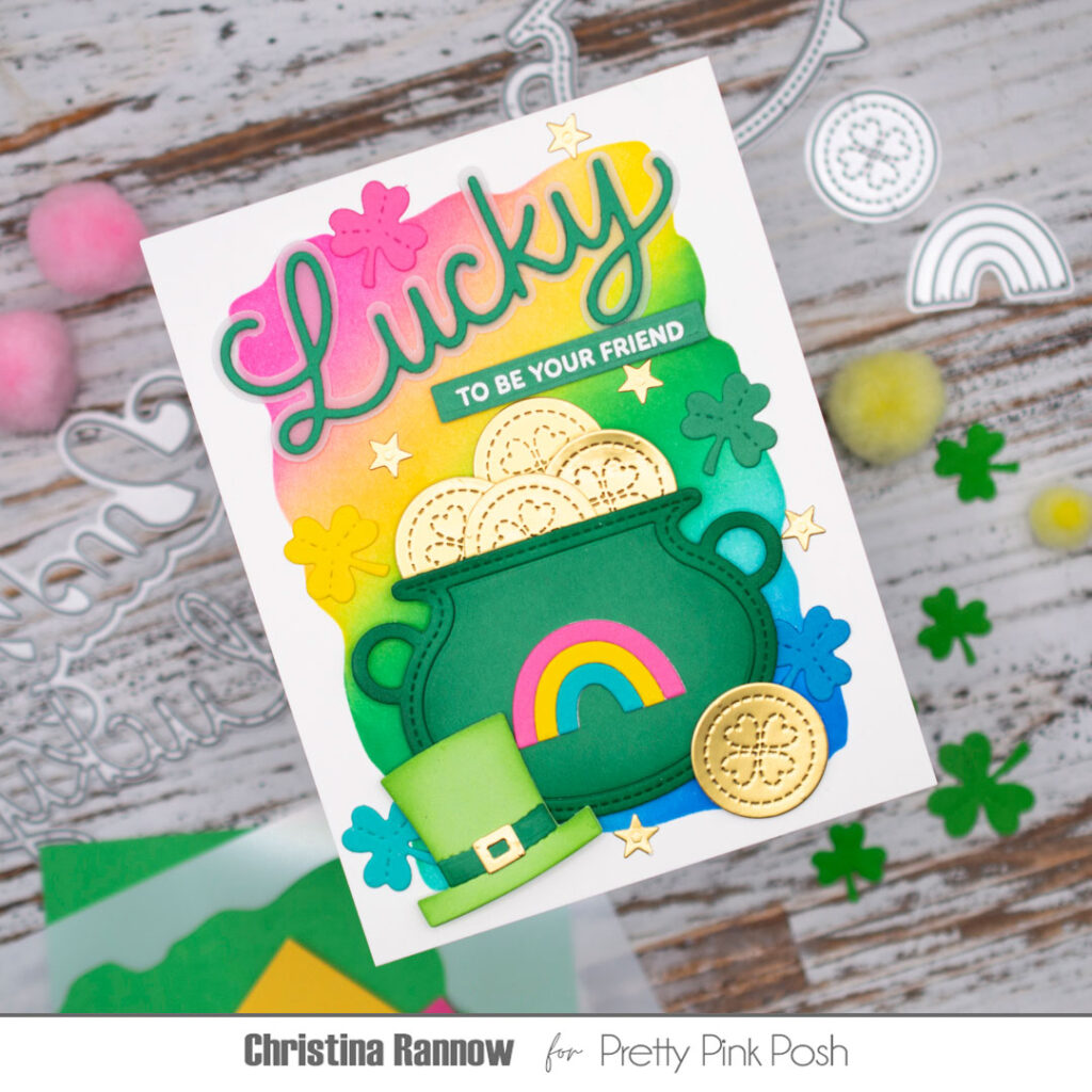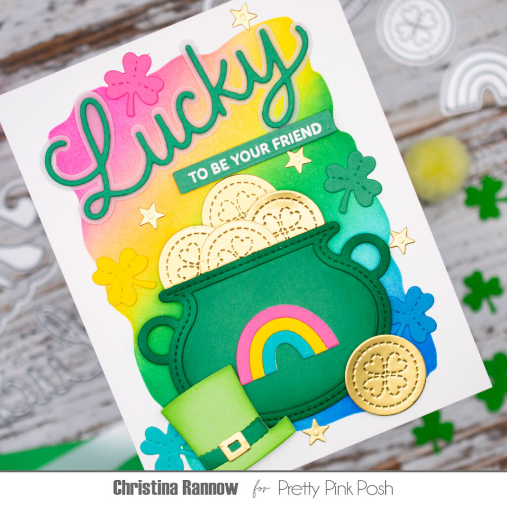 Hi crafty friends! It’s Christina, and I’m excited to welcome you to Lucky Theme Week! We’ll have magical inspiration all week, while anything in the “Lucky” category will be discounted 15% in the shop. Today I’m sharing a lucky rainbow-colored card design featuring something that might be a little unexpected, the Cauldron Shaker. It easily does double duty as a pot of gold using the Lucky Holder Additions to fill it with gold coins. So fun! Take a peek at the supplies I used, and then we’ll get started!
