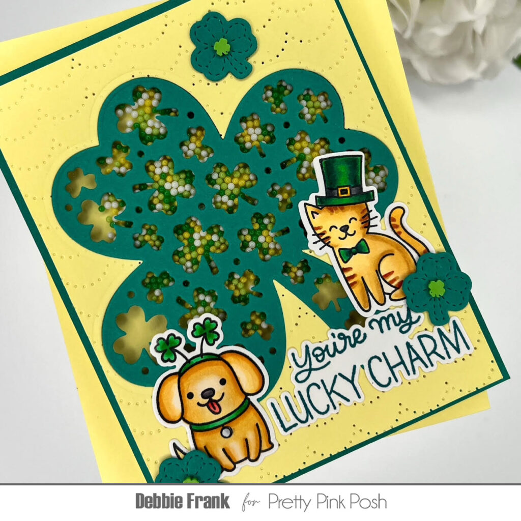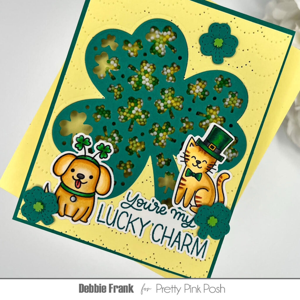 Hi Crafty friends, Debbie here with the Decorative Shamrock Shaker Die for the Lucky Theme week here at Pretty Pink Posh! This is such a great die for a shaker or not. And of course, I had to add some of the adorable Lucky Animals from the newest release too!