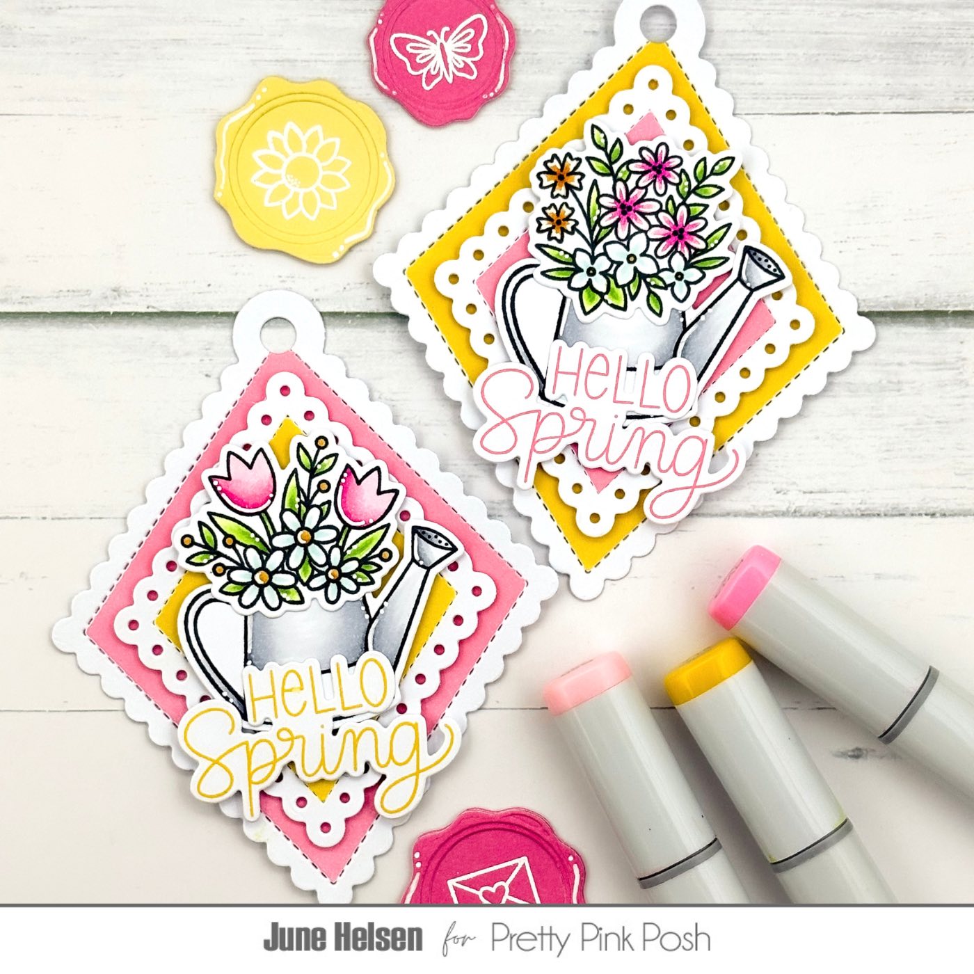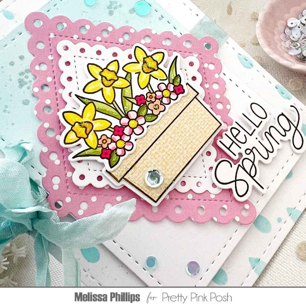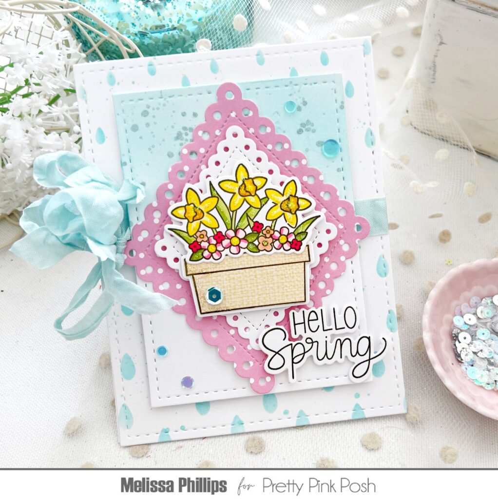 My Hello Spring card uses the darling, newSpring Blooms stamp set and coordinating dies for my focal point. I layered two of the new Eyelet Diamonds die cuts and mounted the pretty flowers on top. I used patterned paper to piece together the pot and Copic markers to color in my flowers.