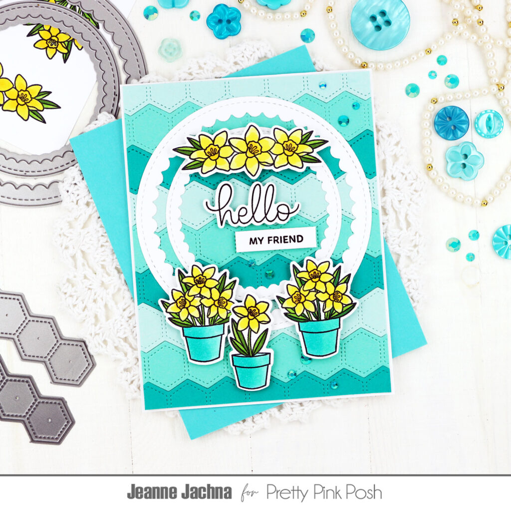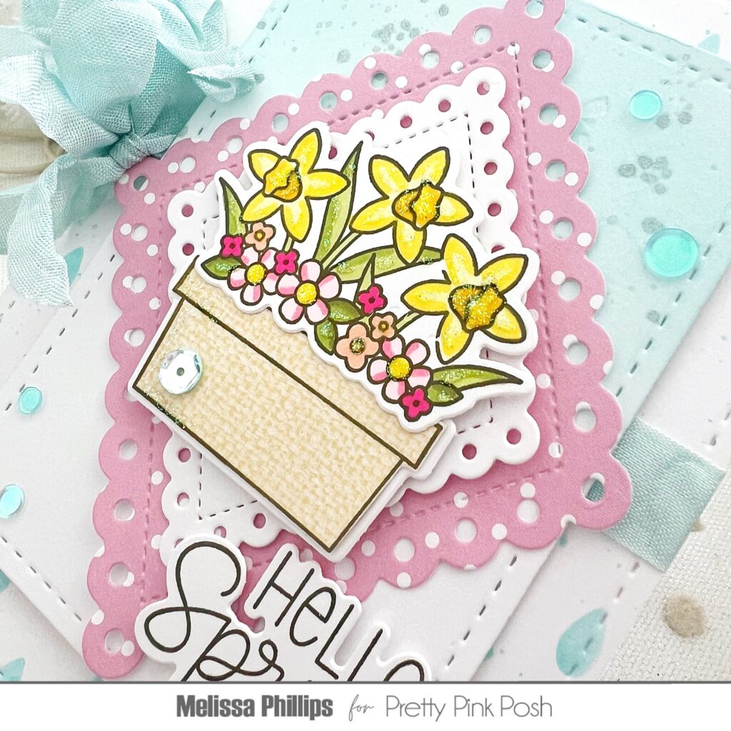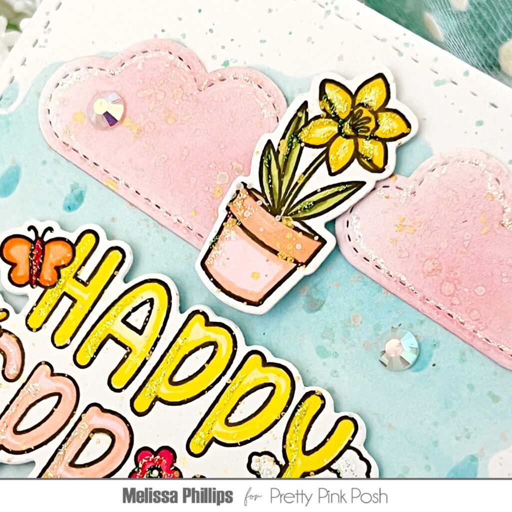 To finish my card, I brought in more daffodils using the new Potted Daffodils stamps and coordinating dies, and even a secondary sentiment at the bottom. This is the sweetest stamp set! All that was missing was some Stickles glitter and gems.
