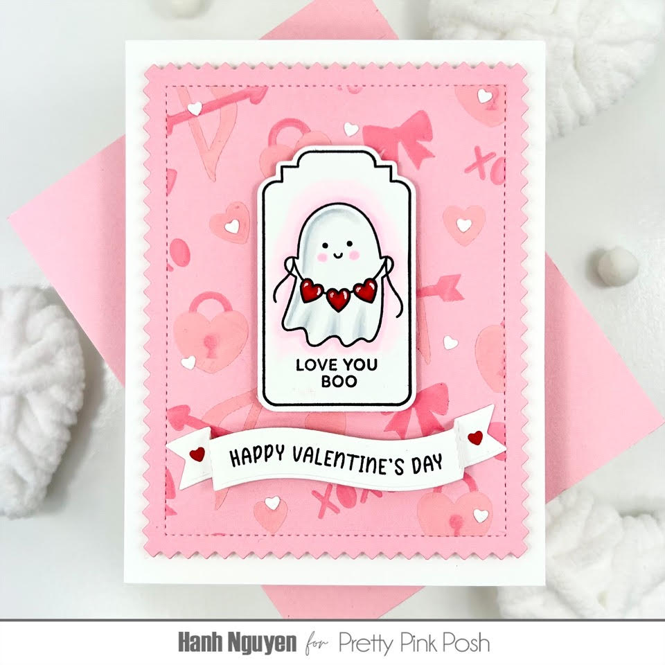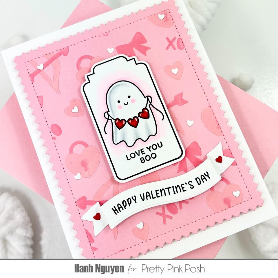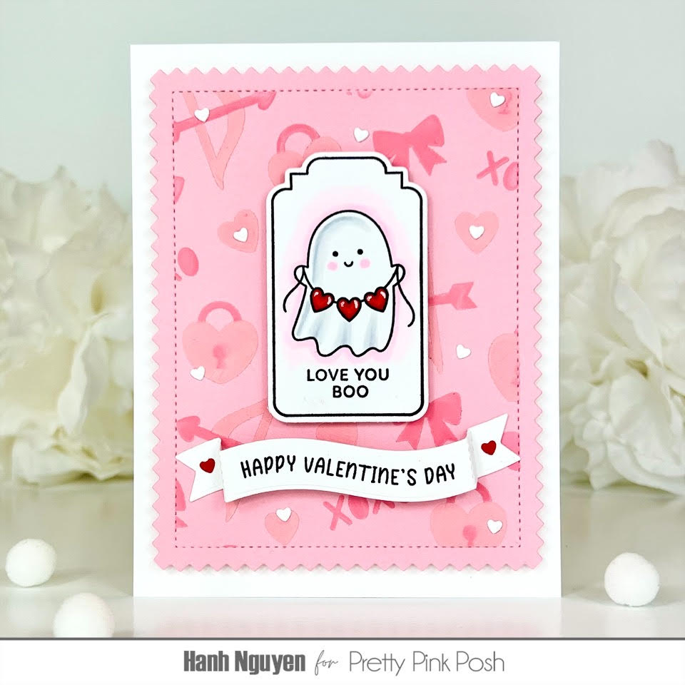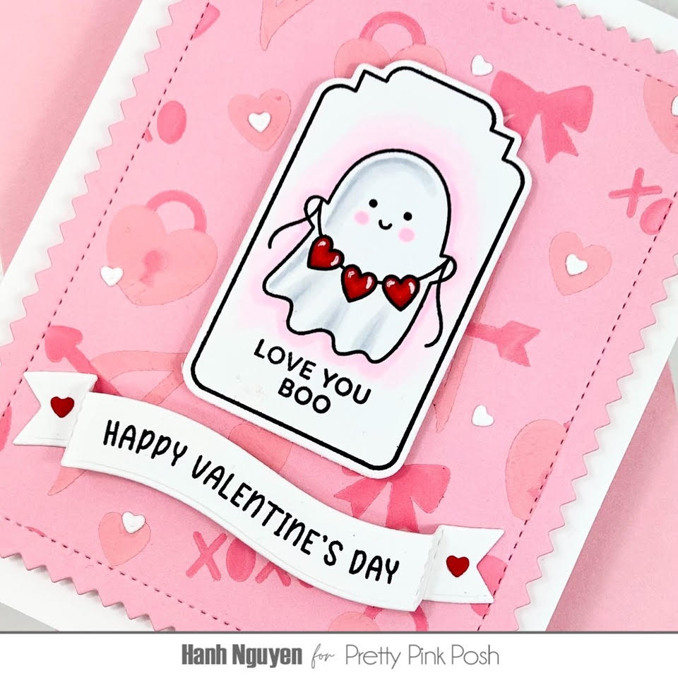 Hello Crafty Friends! It is Hanh here with you today. I am so excited to share with you a sweet Valentine’s Day card featuring the adorable Valentine Tags set. Have you started collecting these Tags Stamp & Die sets? This Valentine Tags is the second set that was released. I absolutely love them! You really get a bang for your buck with these. They obviously can be stamped and diecut to make tags for gift bags and boxes. They can also be used to make cards, as I have done today. In addition to those options, these coordinating Valentine Tags Dies are great basic tag shapes that can be used as stand alone tag dies. I can see myself using these coordinating dies with the Valentine Ghost Friends to make a whole set of matching tags. I sure hope there are more of these Tags Stamp & Die sets released in the future. So let’s get started.