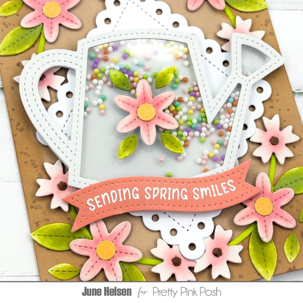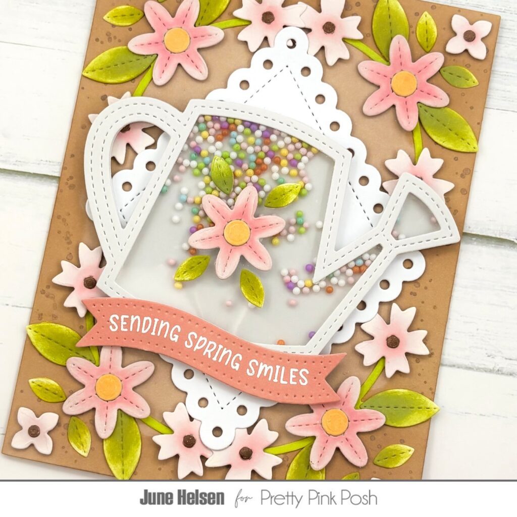 I cut a Watering Can Shaker from light grey cardstock and filled it with Bunny Hop Shaker Beads. Both shaker bead mixes in this release are so my style, it was hard to decide! And here’s where those leftover flowers come in! I added them on the watering can to give it a fun little detail.