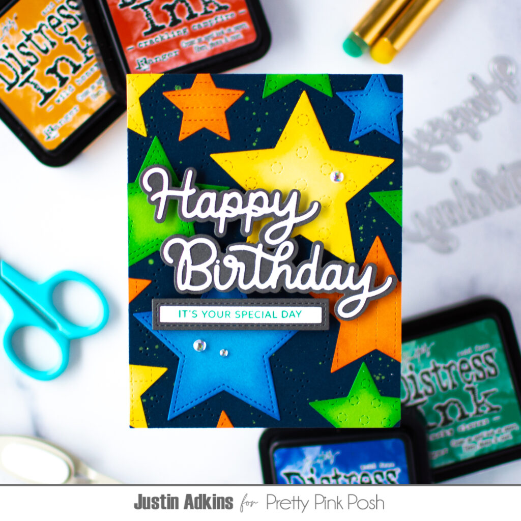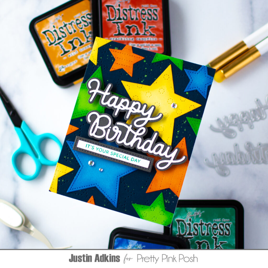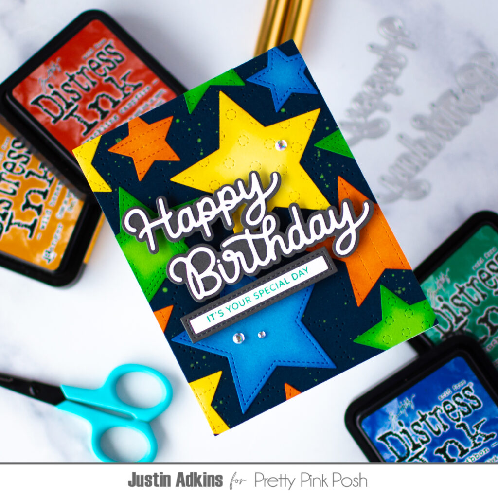 Hello, friends! Justin here, and, today, I’m sharing a bright and bold birthday card that is full of color, texture, and layered dimension. If you enjoy creating vibrant cards that really stand out, this design is a fun one to try. I’m also sharing a full step-by-step tutorial over on the Pretty Pink Posh YouTube Channel so you can see exactly how this card came together.