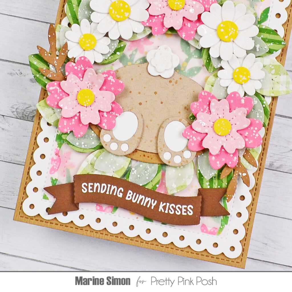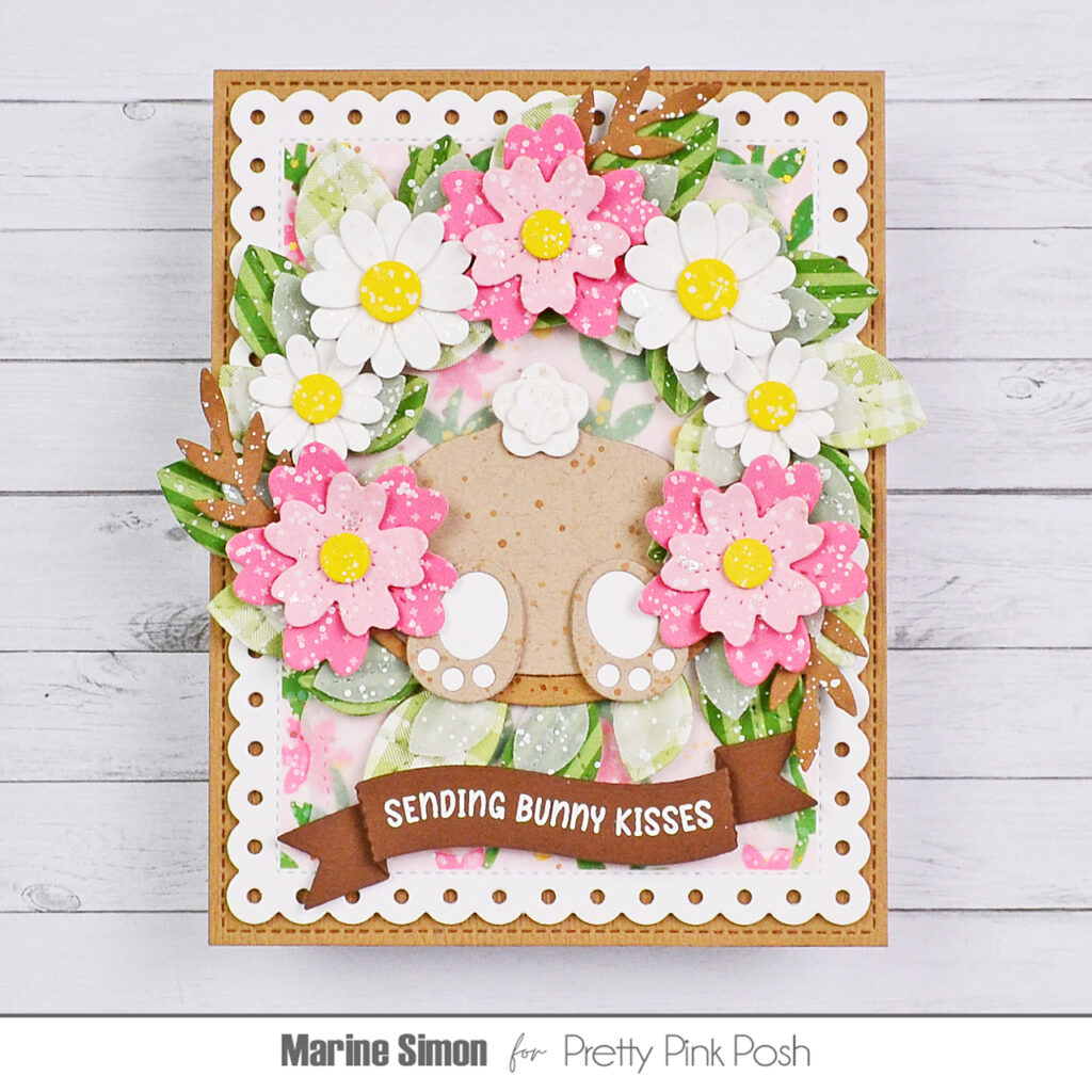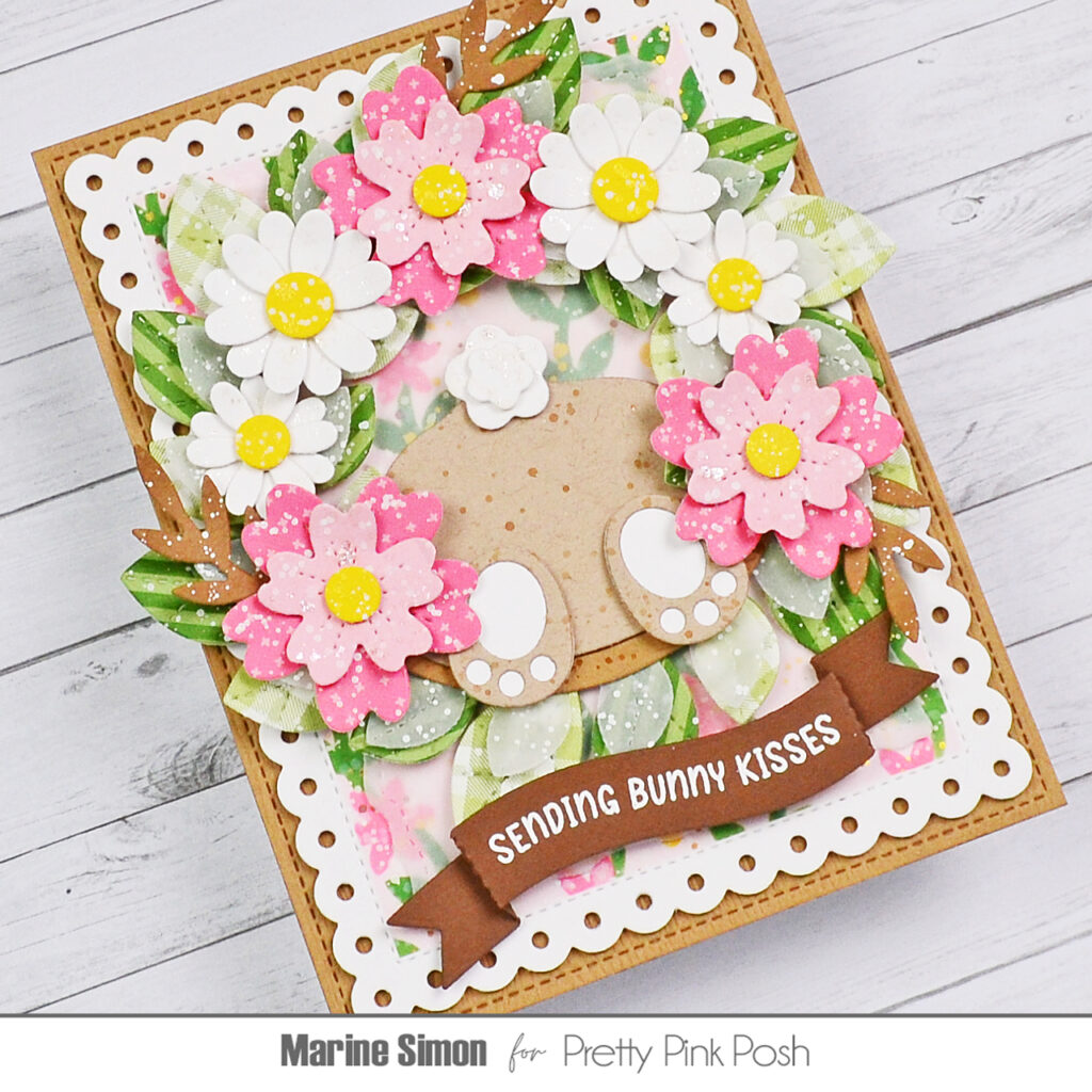 Hi crafty friends, Marine here, I’m back with this cute and pretty card showcasing a beautiful floral wreath and a cheeky bunny ready to properly celebrate the arrival of Spring. Obviously, here I put flowers in my wreath to create a Spring themed card, but you definitely could replace them with Easter eggs for a cute and fun Easter themed card. The Pretty Pink Posh die collection is so diverse that the possibilities are endless!