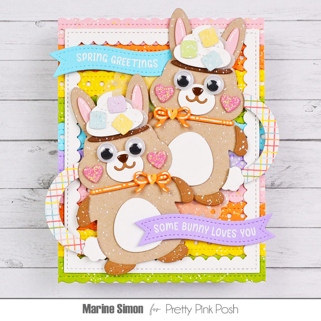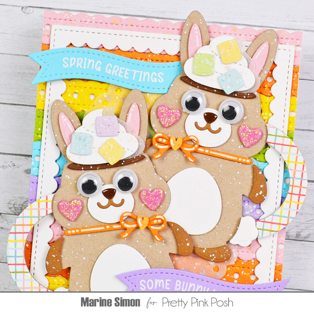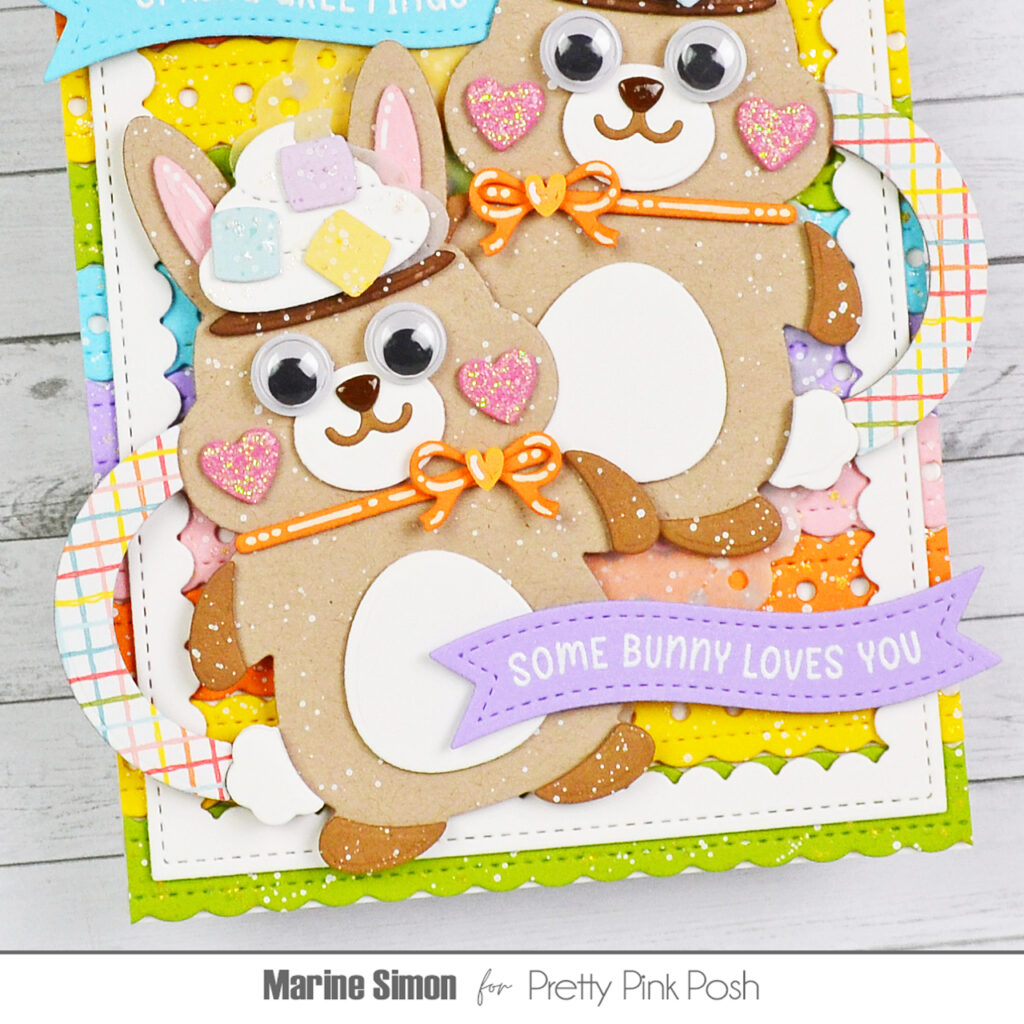 I gave both of the bunny mugs a pair of googly eyes to make them extra cute, applied glossy accents to their nose and white blizzard nuvo drops to their cheeks, and picked orange hearts from the Colorful Hearts confetti mix that I glued in the center of each bow tie. To tone down my colorful background a bit, I cut a large Eyelet Oval panel out of vellum, added white splatters to it and attached it right in the middle of my Doily Borders panel. Next I stuck the Easter Bunny Mugs using 1mm foam for one and 2mm foam squares for the other, and then stamped two Easter Banner Greetings. I white heat embossed “Spring Greetings” on blue cardstock and “Some Bunny Loves You” on purple cardstock, used a Banner Greetings 3 die to cut the first one and a Banner Greetings 1 die to cut the second one, and finally attached them both to my card using foam squares.
