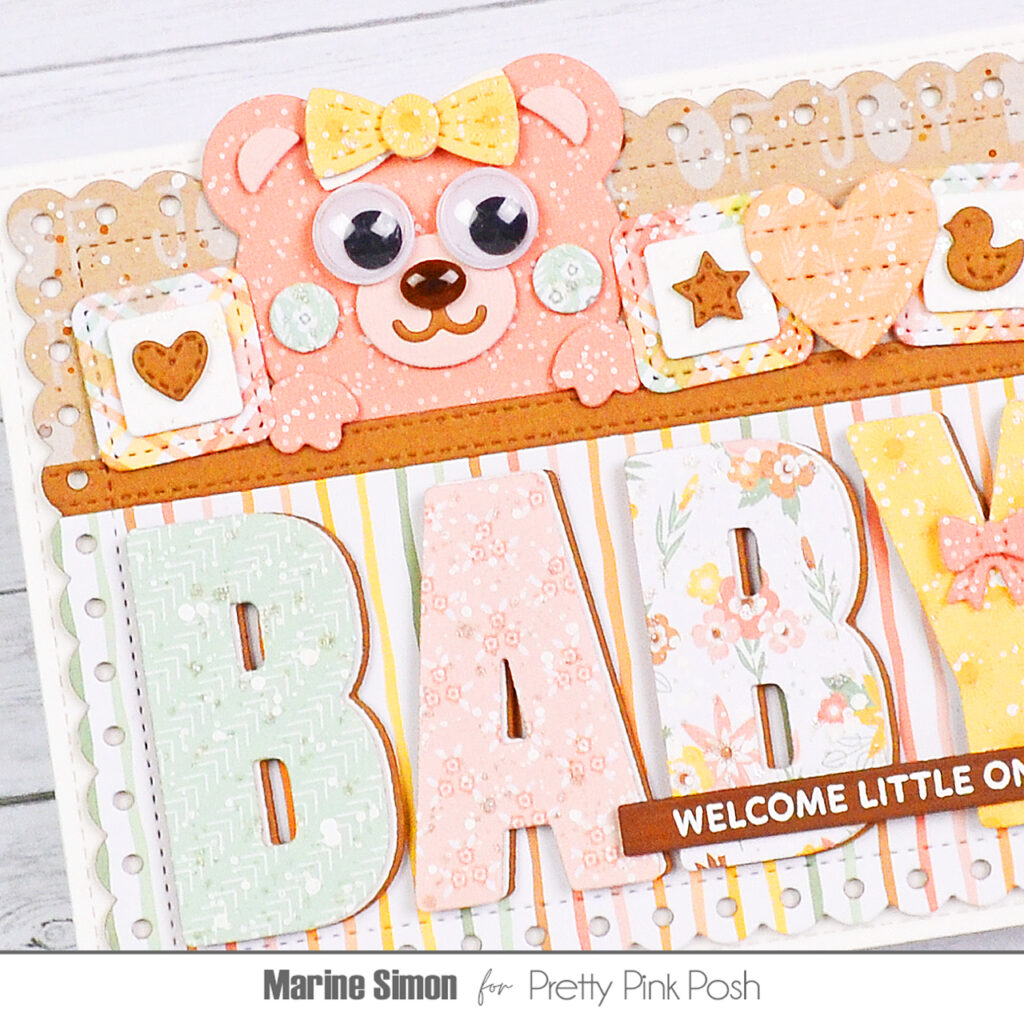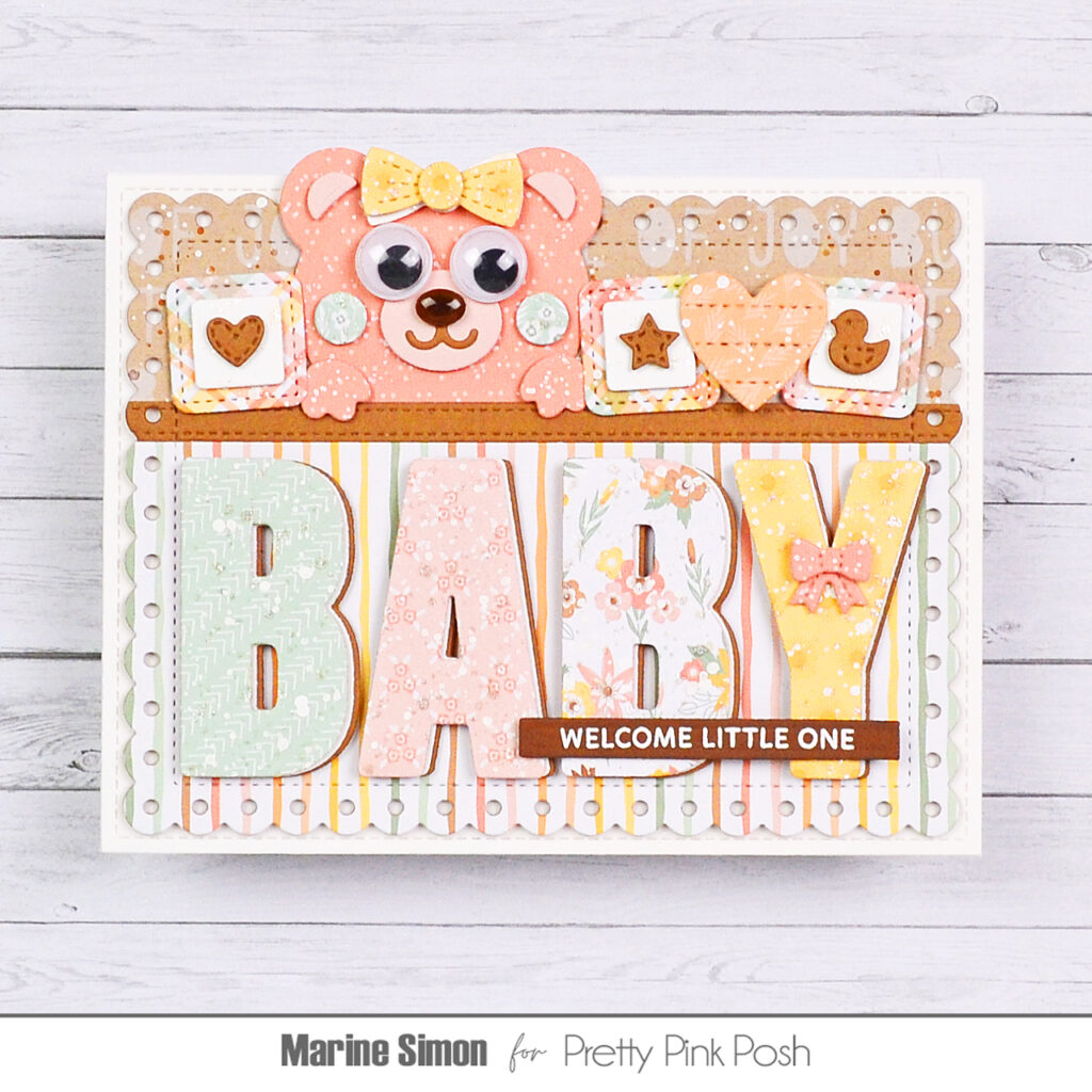 Hello crafty friends, Marine here, I’m so happy to be back with this lovely baby themed card I’ve made to celebrate the birth of the sweet Kaia. The idea here was to create a half paneling wall with a wooden board on top to put baby items and decorations on, and maybe have enough space for a cute stuffed teddy bear to sneak a peek and keep a close eye on Kaia while she sleeps. And I’m usually a fan of bright and bold colors, but here I went for a soft and lovely color palette using papers from the Our Baby Girl 6×6 paper pack by Echo Park.