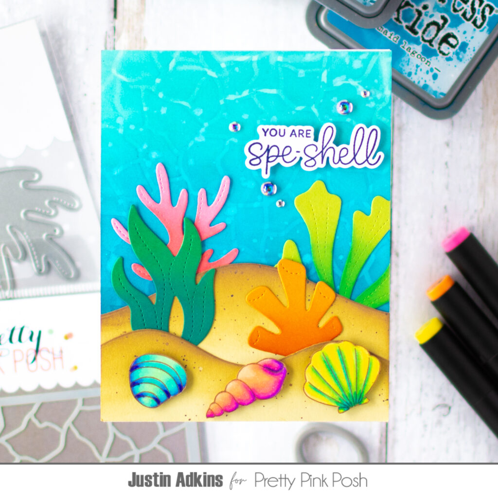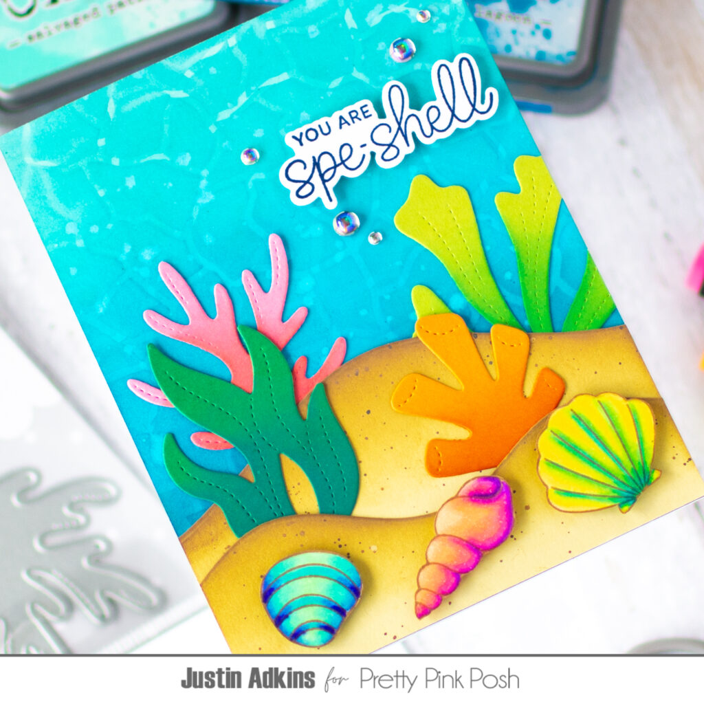 Hello, friends! It’s Justin Adkins and today I’m sharing a card that’s bringing all the warm, sunny vibes. This time of year always gets me thinking about Spring Break and a little escape to somewhere tropical—so I decided to get inky and create a bright underwater scene!