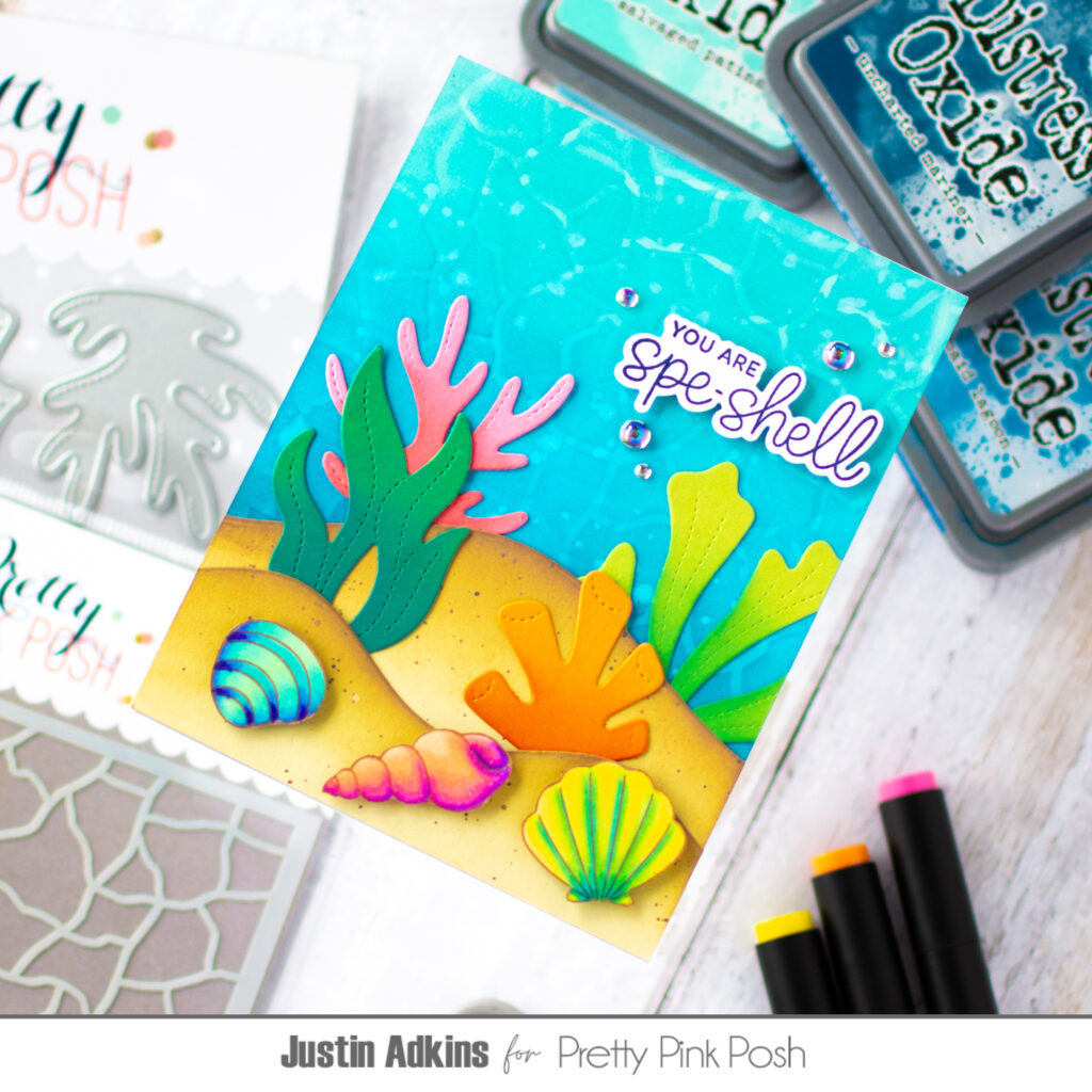 For the coral, I die cut the pieces using the Stitched Coral Dies and ink blended them with Distress Oxide Inks in Abandoned Coral, Ripe Persimmon, Lucky Clover, and Pine Needles. These bold colors really bring the scene to life.