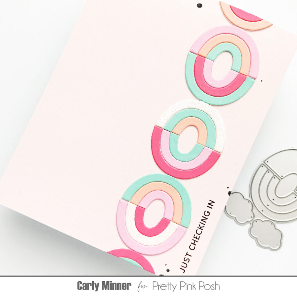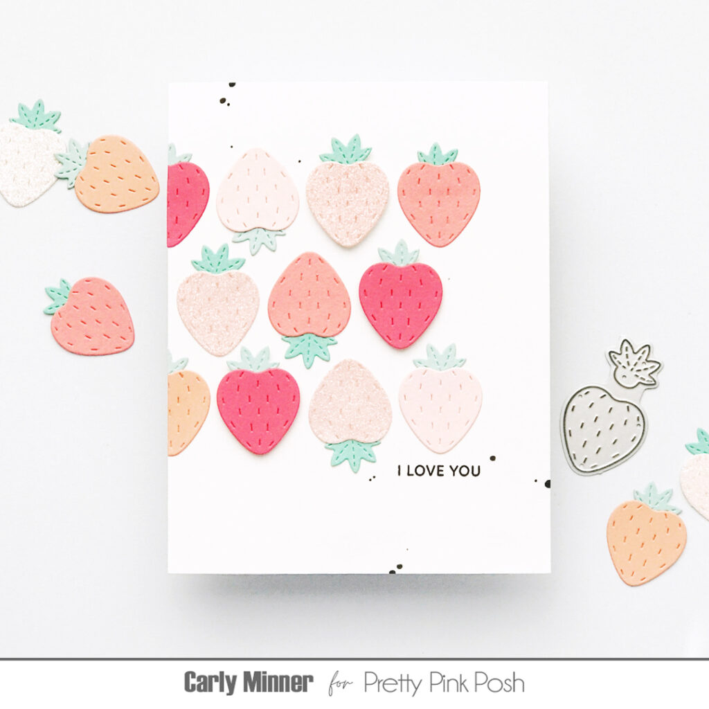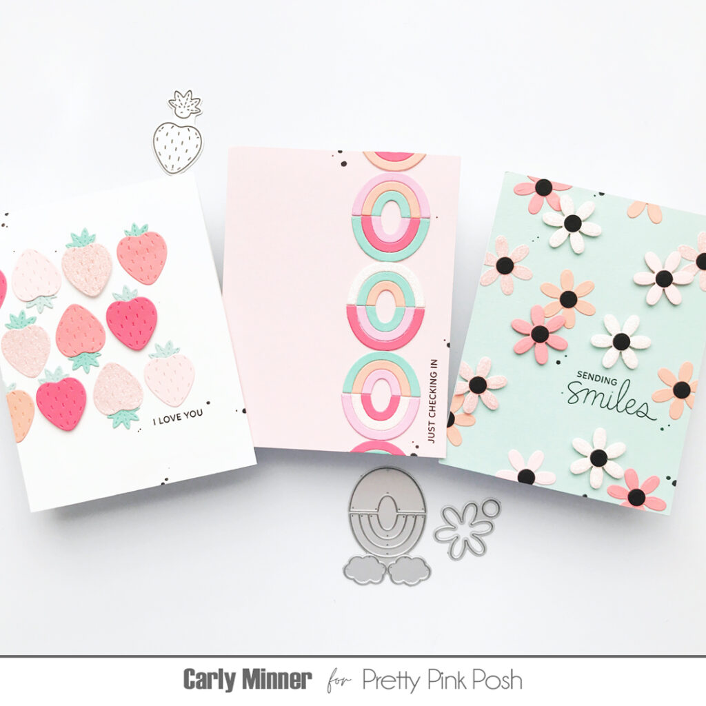 Step #1: Go through your stash of Pretty Pink Posh dies (or treat yourself to a few new ones) and find some of your favorite small shapes. For these cards I used the strawberry from Big Celebration Cupcake, the rainbow from Get Well Mug Additions and a flower from Easter Bucket Additions.