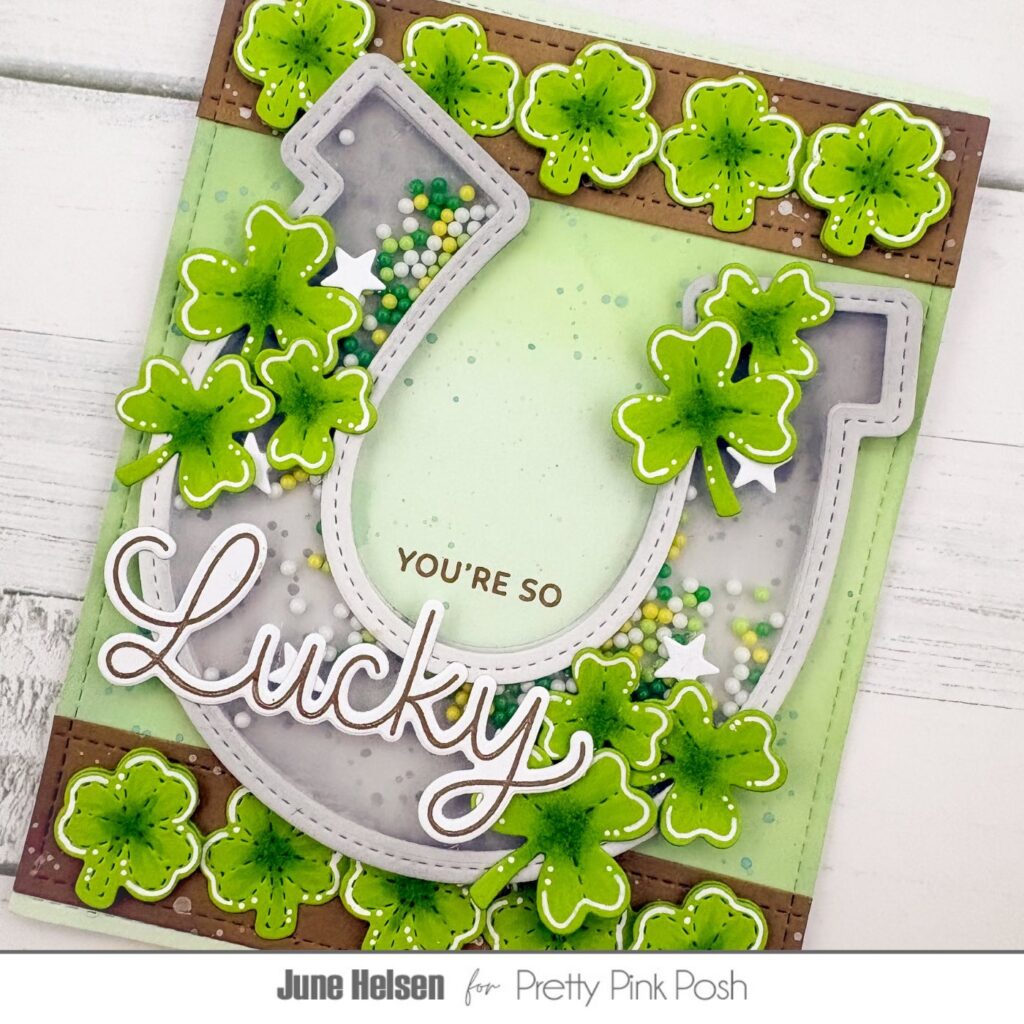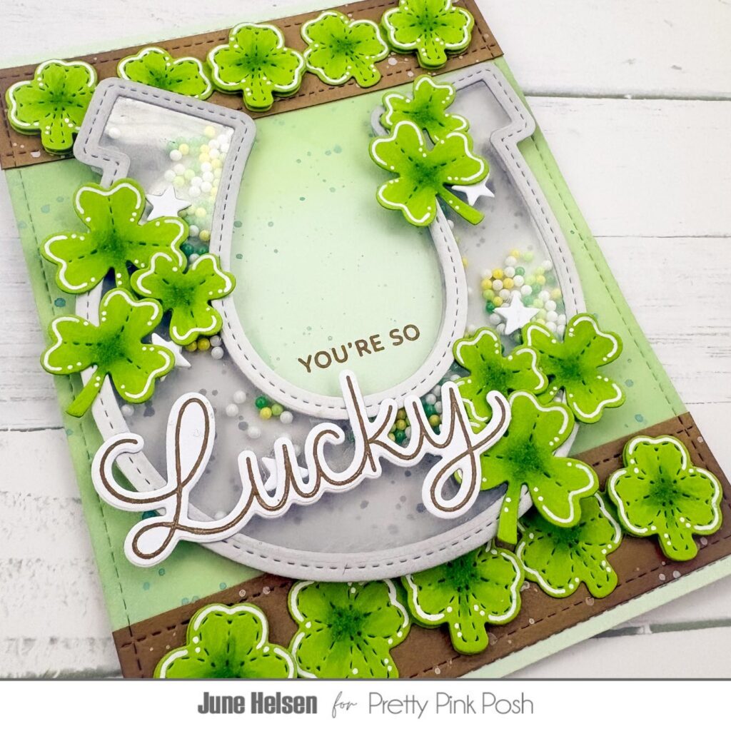 Hello crafty friends, June here! Today I’m sharing a Saint-Patrick’s Day card. I was so excited when I saw the Horseshoe Shaker! The shakers are always the dies I’m most excited about seeing each release and this release did not disappoint. Both the Ladybug Shaker and this one are right up my alley! I can’t wait to turn this horseshoe into a cowboy themed card sometime, but first I wanted to use it the way it was intended: to wish some good luck during Saint-Patrick’s Day!