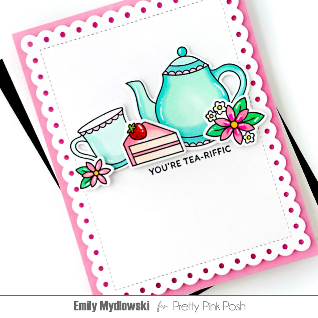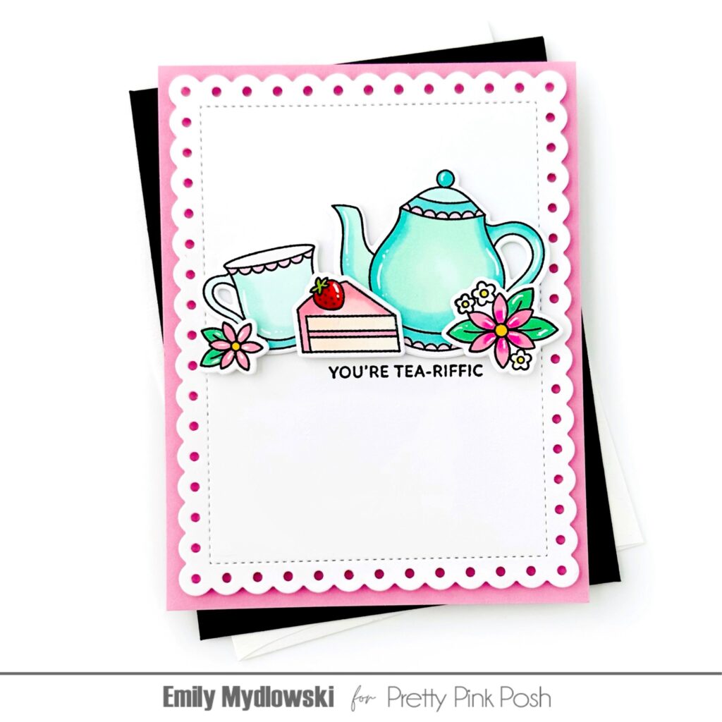 I temporarily taped the Eyelet Oval vellum panel right in the middle of the card base using washi tape, and then I attached the images using 1mm and 2mm foam squares, making sure to put the squares only on the vellum panel. I started with the teapot and teacups, next the plate with the piece of cake, and then the mice. I removed the washi tape, flipped my vellum panel over, added liquid glue at the back of the panel, right behind the images, and finally attached the vellum panel to the card. At the top and bottom, I stuck strawberries and greenery using foam squares again, and added steam above the teacups.