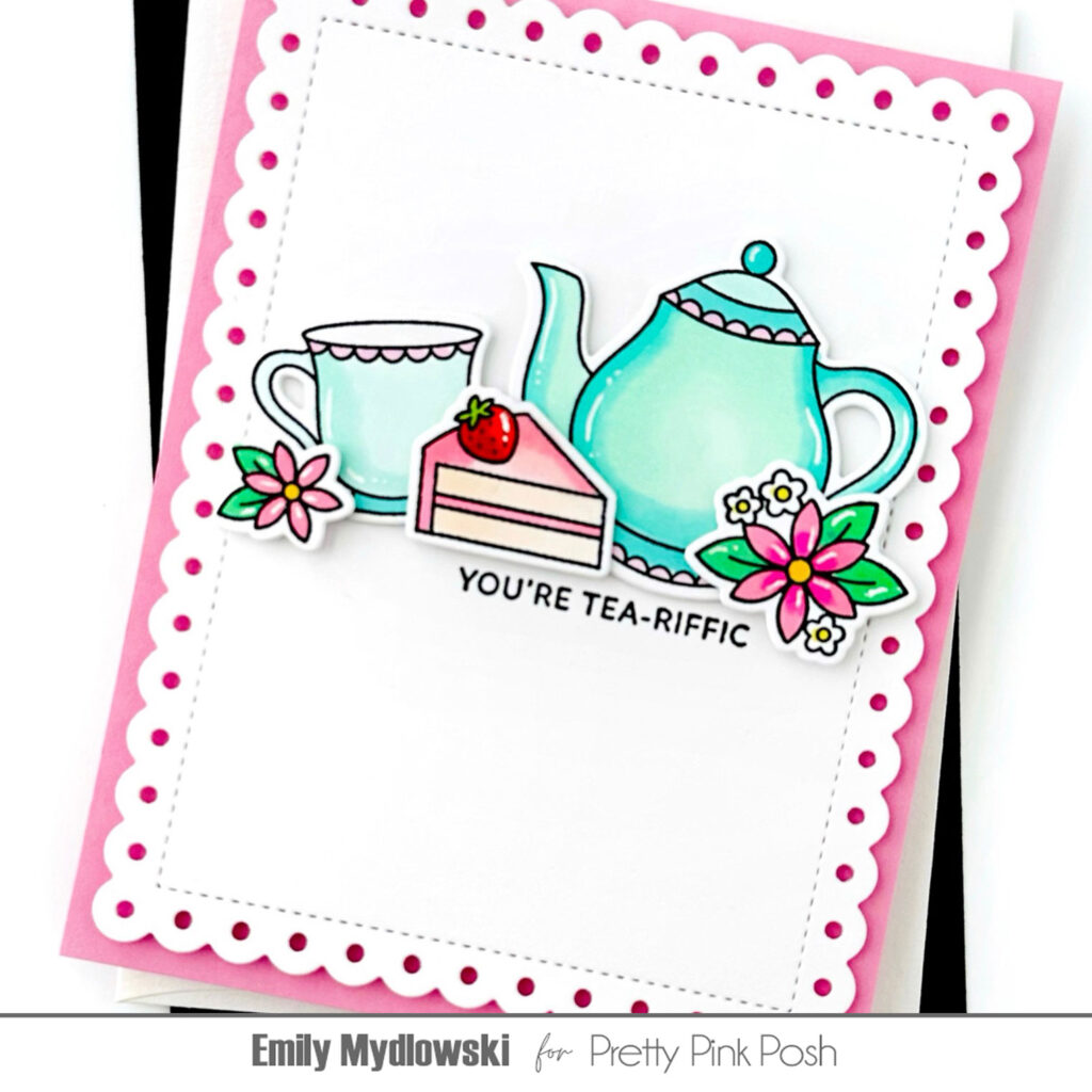As always, here is a detailed list of the stamp sets I used: • Tea Time – teapot, teacups, plate, piece of cake, spoons • Friend Greetings – greenery • Mouse Friends – mice, strawberries • Valentine Train – steam.