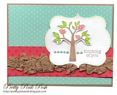 It’s been quite a while since I pulled out this adorable Dotty Tree Birds stamp. Did you notice that even the trunk on the tree has polka dots? I think that’s what I love most about this stamp. However, I love those little birds too! I brought out my newly purchased die from Taylored Expressions (love it!) and went to town. Oh yes, and I couldn’t resist using more of my wrinkled ribbon!