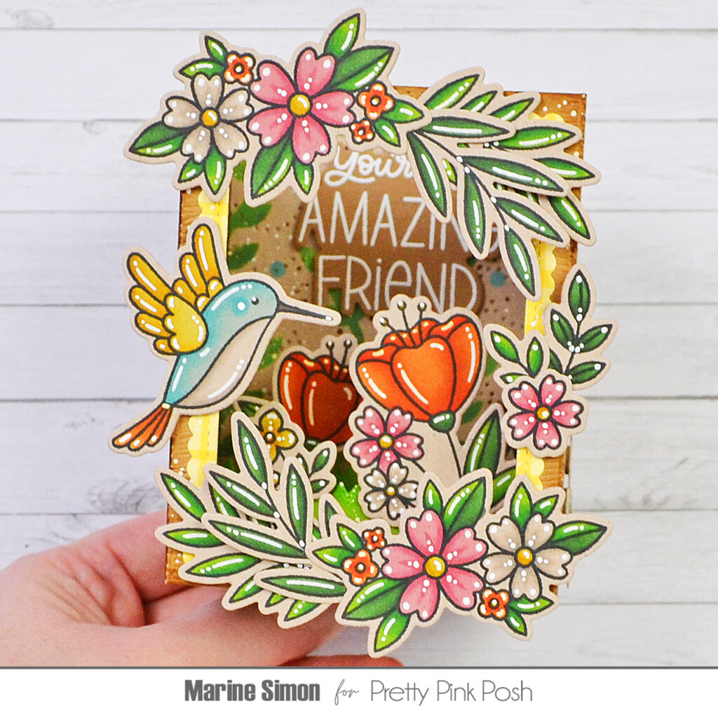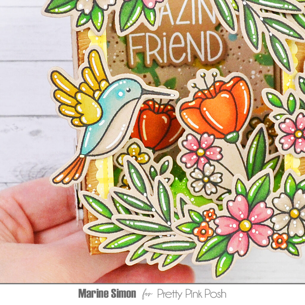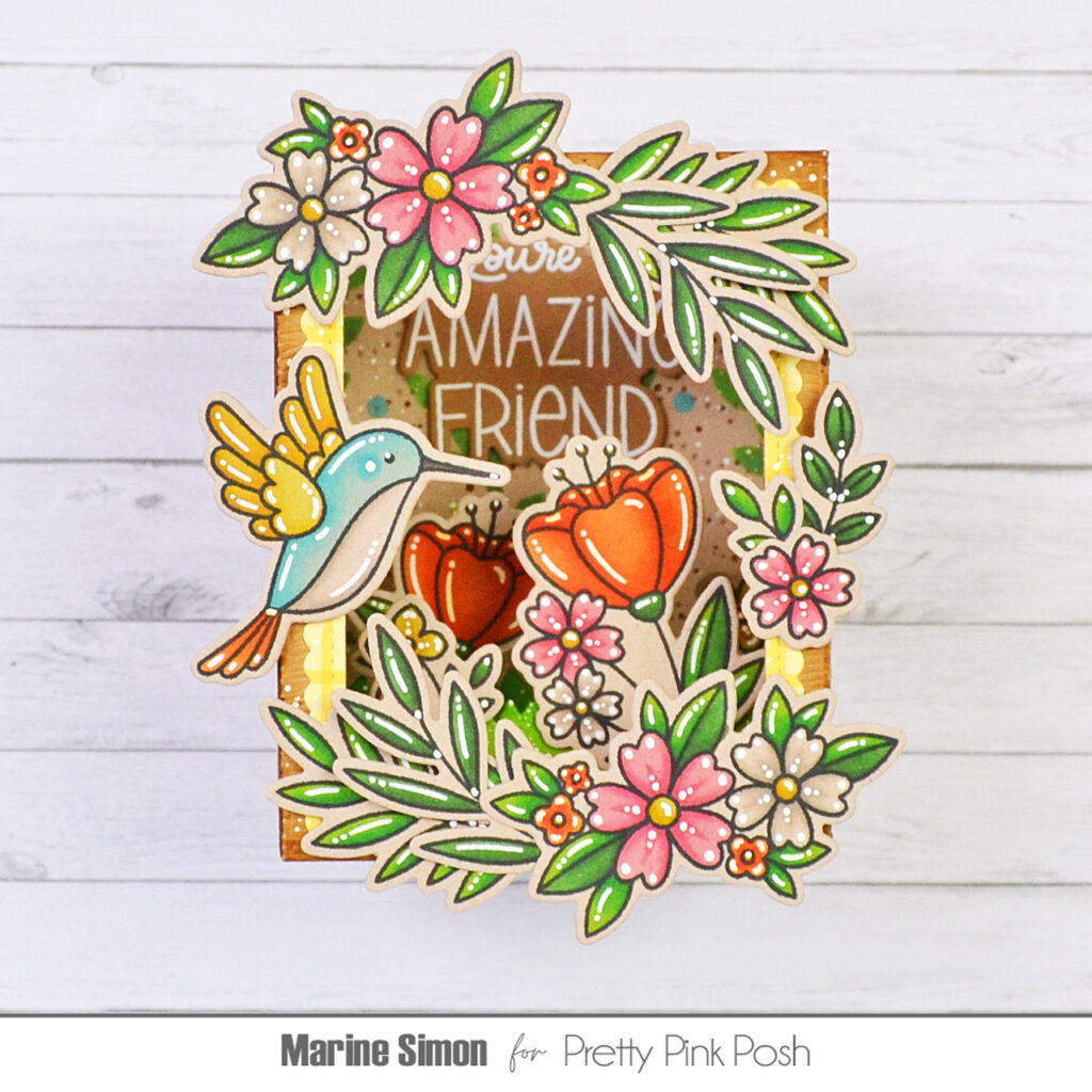 Once everything was colored, I added highlights and details to the images using a white gel pen. Next I attached the images inside the Shadow Box, directly on the grass inserts using foam squares, as well as on the outside of the box, most of them on the front, but I also added a small floral cluster on each side of the box for more cuteness. Finally, I white heat embossed “You’re an amazing friend” from Friend Greetings on brown cardstock, cut it using the matching die, and attached it inside the box, directly on the background, using 1mm foam squares.