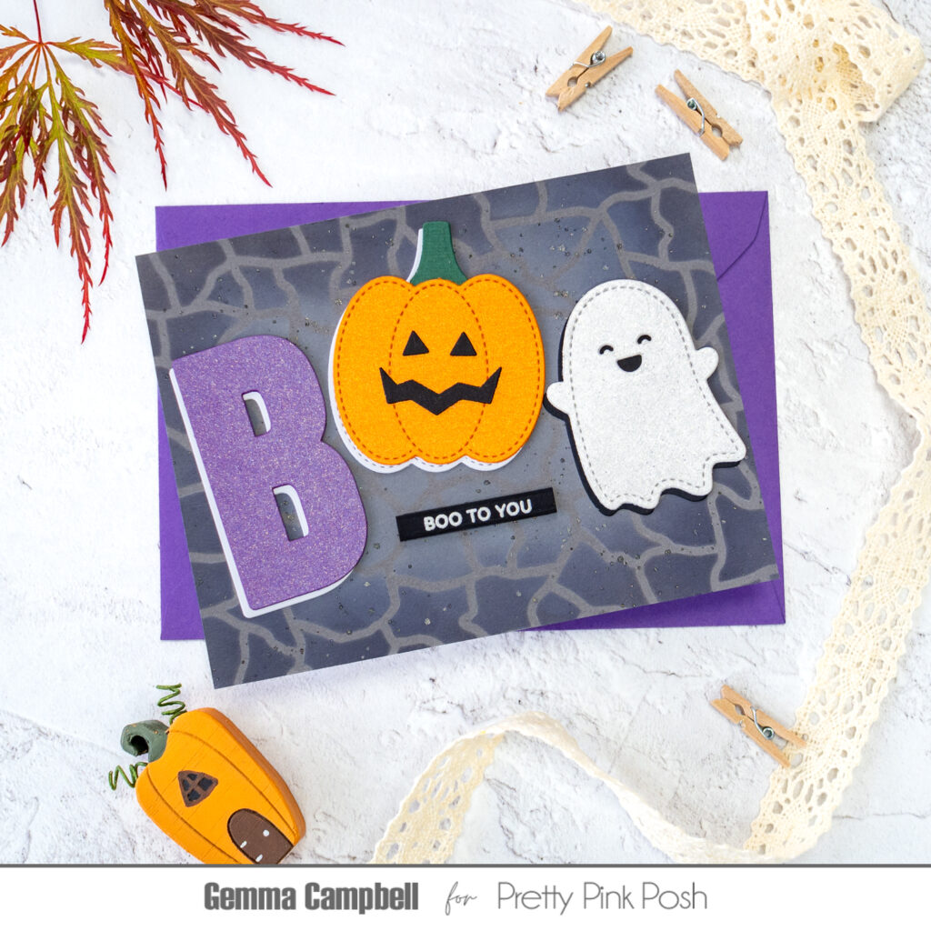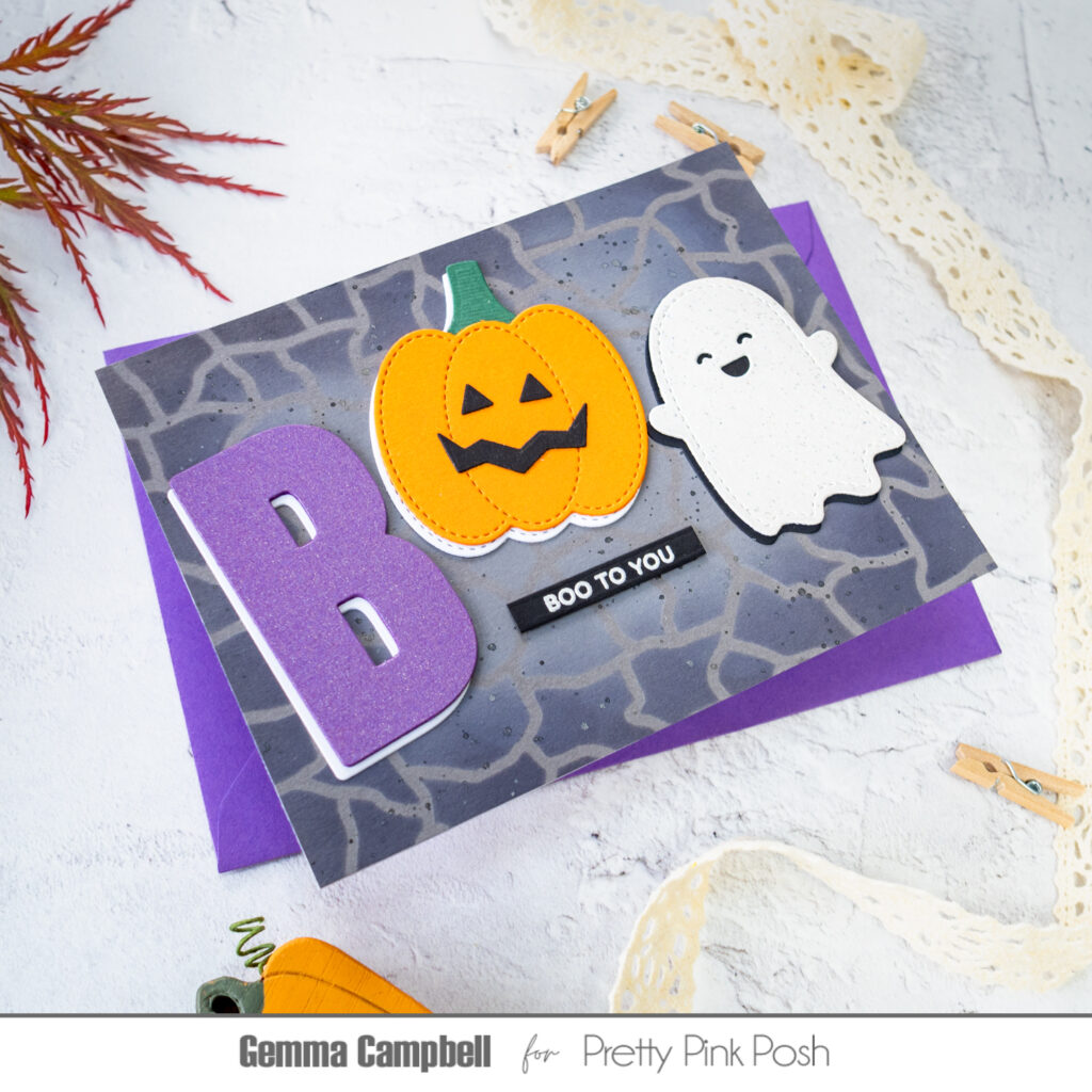 To create a large word across the front of my card, I started with the coordinating die from the Boo stamp set for the letter B. I die cut it from purple card, adding some layers and an offset white layer to help it stand out from the background.