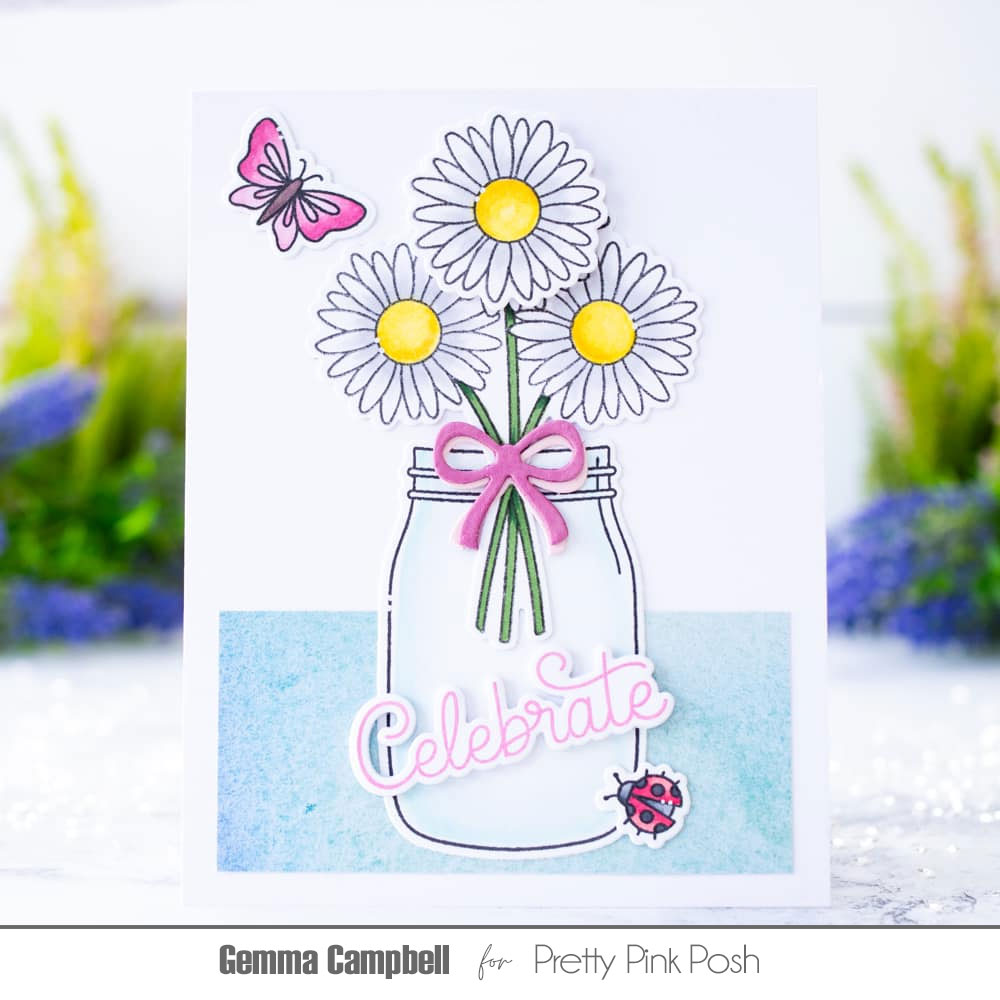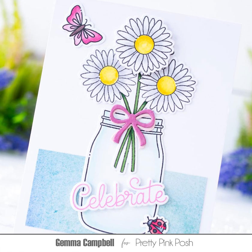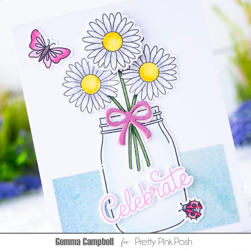 I love the image of a bouquet of daisies that’s included in the set. I coloured it with copic markers, along with an additional single daisy flower, then die cut the images with the coordinating dies.I also coloured and die cut some images from the Spring Jar stamp set.