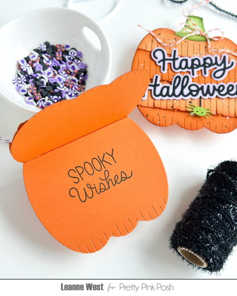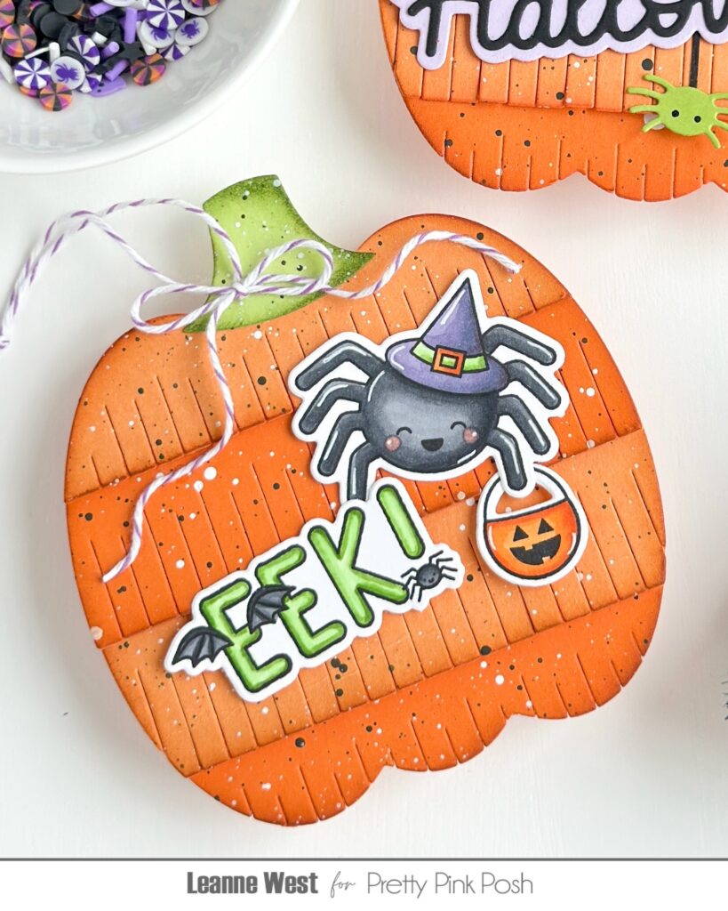 I die cut my pumpkin tags from two shades of orange card stock. I shaded the edges with a dark orange ink and then added lots of paint splatter to each layer. Once all the layers of the Fringe Pumpkin are adhered, you can add any embellishments or greetings you’d like. I added some cute halloween images to the front of one of the tags. These images are from the Spider Friends and Halloween Word Scenes stamp sets. On the other tag I used the Happy Halloween Shadow dies.
