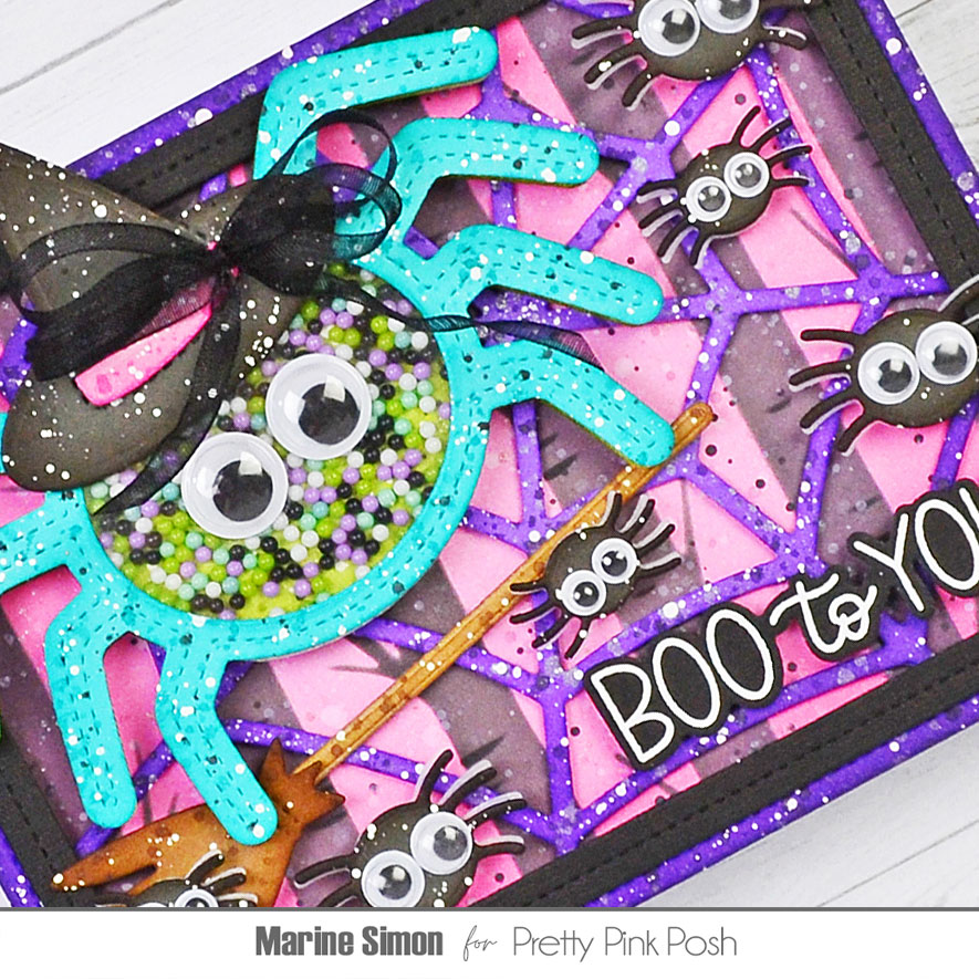 I white heat embossed “Boo to you” from Halloween Greetings on black cardstock, cut it with the matching die, attached it at the bottom right hand corner of my card, and stuck some spiders, starting with the larger one, using foam squares. I slid the broom behind the Spider Shaker‘s legs, attached more spiders, stuck the hat on the big spider’s head, and finally gave her a pair of giant wiggly eyes. And that’s it! I hope that you like this fun shaker card. I know I’d have a panic attack seeing that many spiders in real life, but as I was saying at the beginning, as long as they’re made out of paper, I don’t mind playing with them!