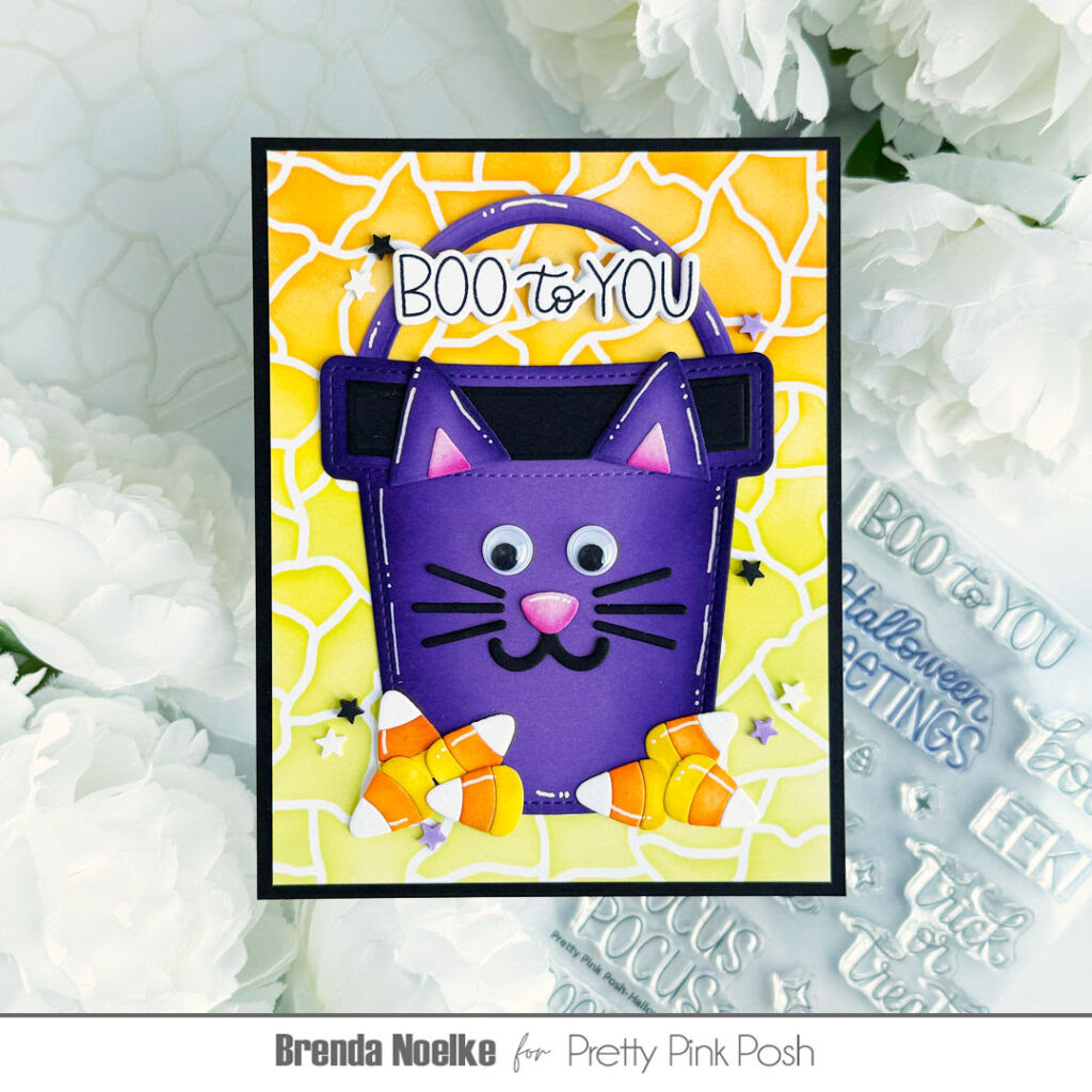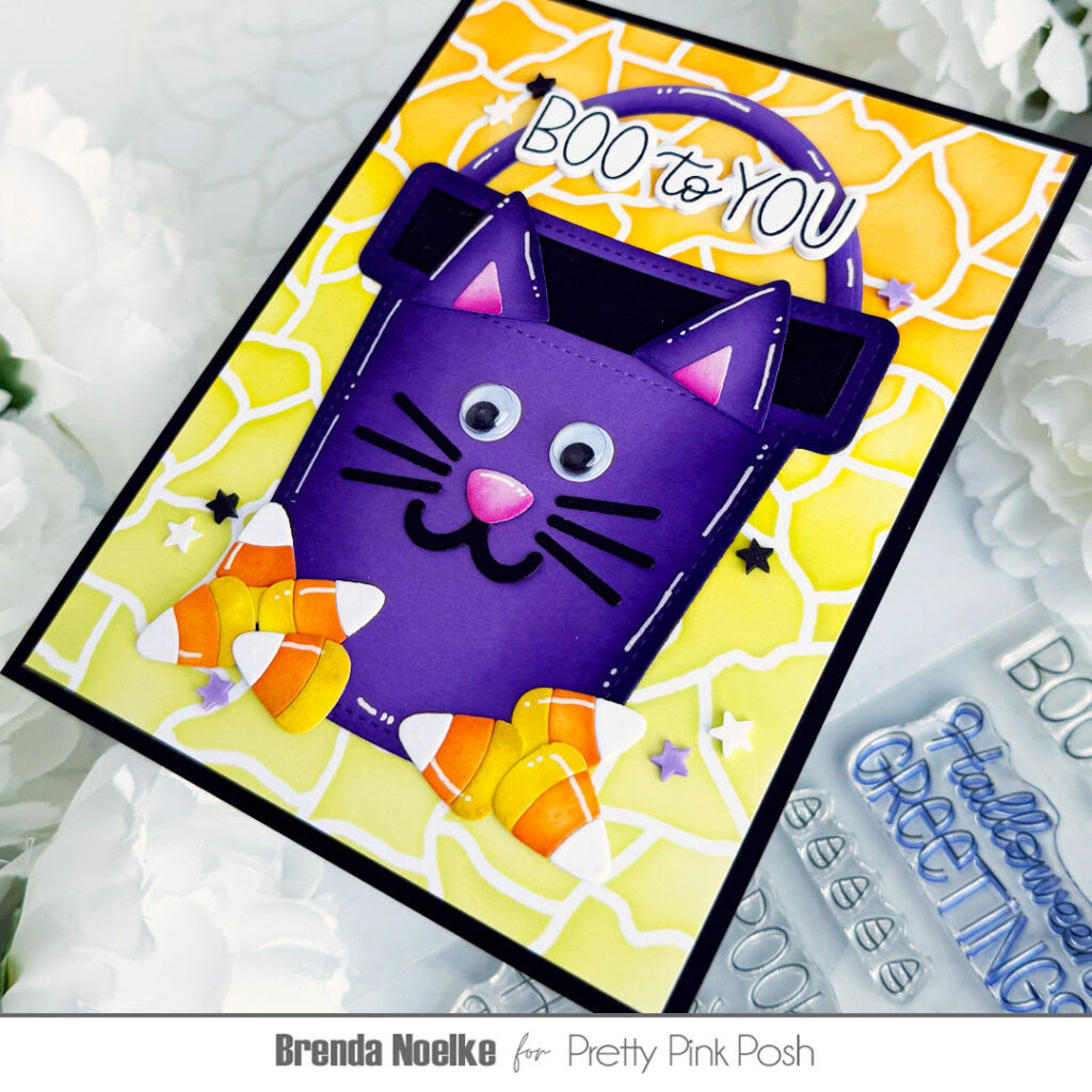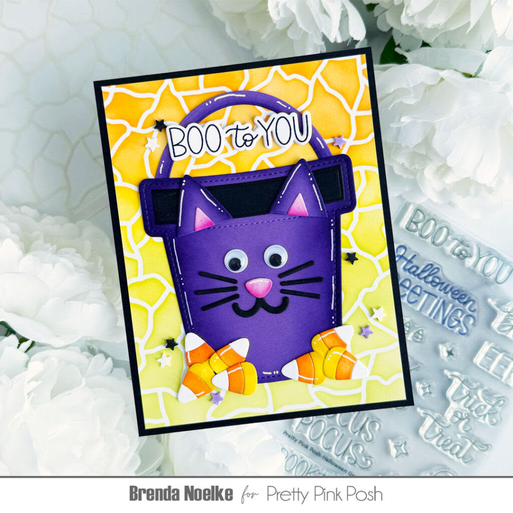 For the background, I lightly blended Carved Pumpkin, Mustard Seed and Twisted Citron Distress Ink onto a panel of smooth white cardstock using the Crackle Background Stencil. I trimmed the panel slightly and adhered it to an A2 panel of black cardstock. The bucket was adhered to the background with liquid glue. The candy corn dies are also included in the Halloween Bucket Additions Die Set. All the pieces were cut from white cardstock, blended with Mustard Seed and Carved Pumpkin Distress Inks and highlighted with a white gel pen. They were adhered together, then added around the bottom of the bucket with liquid glue.
