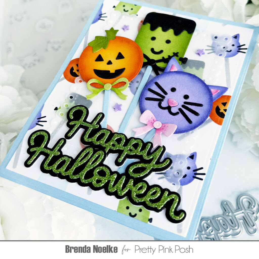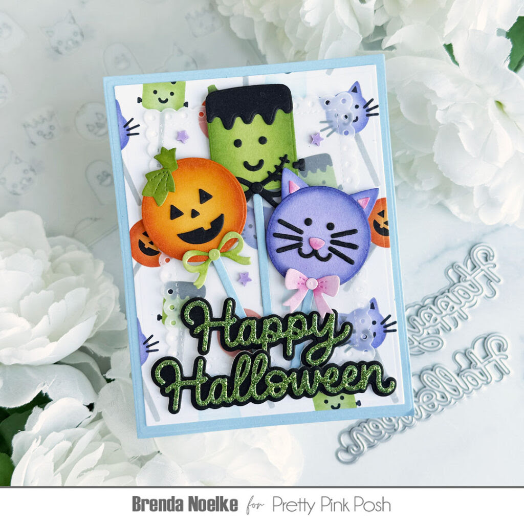 Hello, friends! Brenda here and I’m super excited to be back on the Pretty Pink Posh blog today! My card features the absolutely darling Halloween Cake Pops Die Set, Cake Pops Layering Stencils and the Happy Halloween Script Dies!