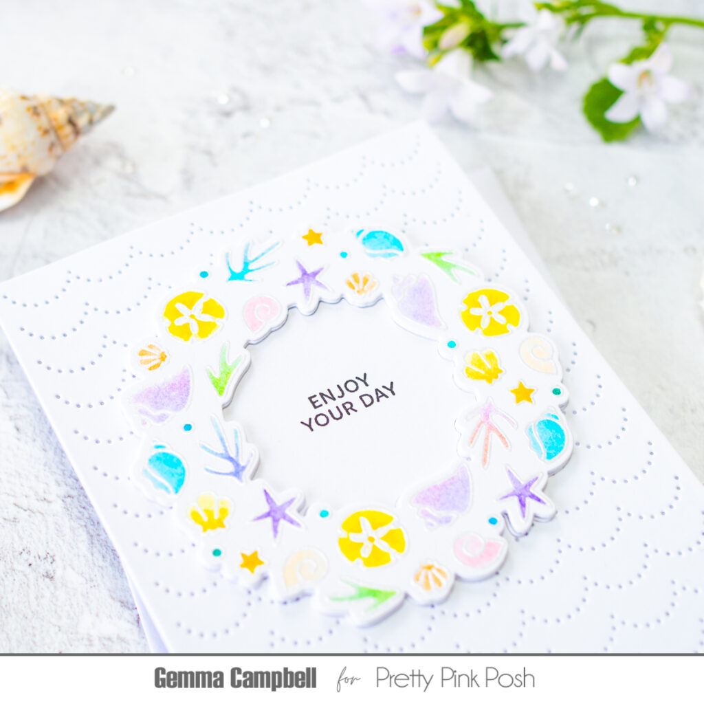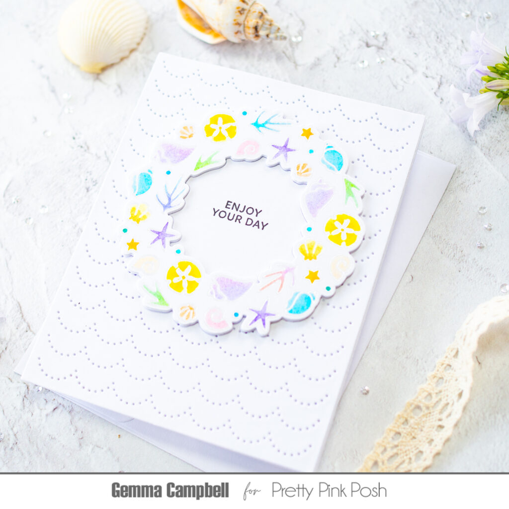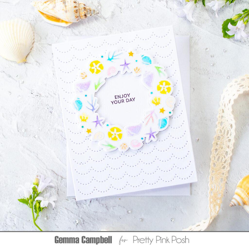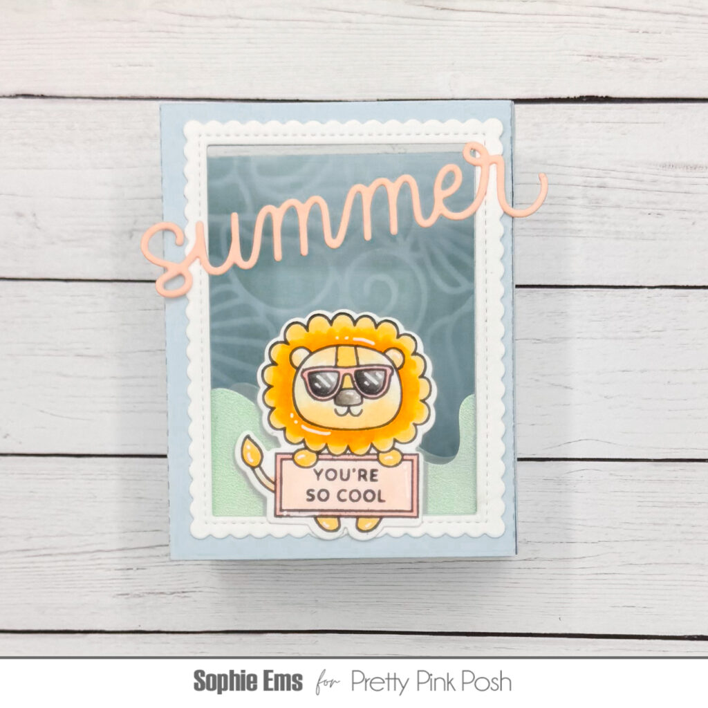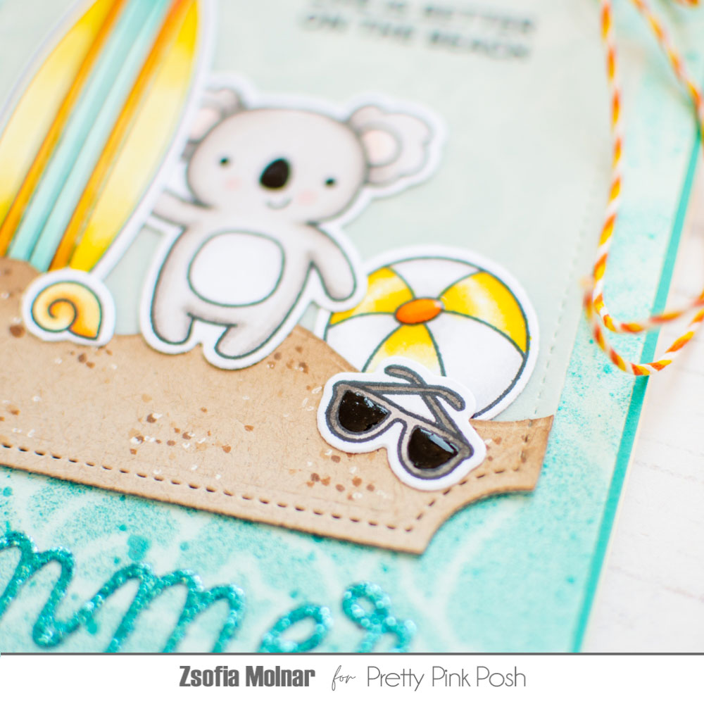 Behind the window, I added die cut waves and a sandy shoreline with the Shoreline Borders Die.