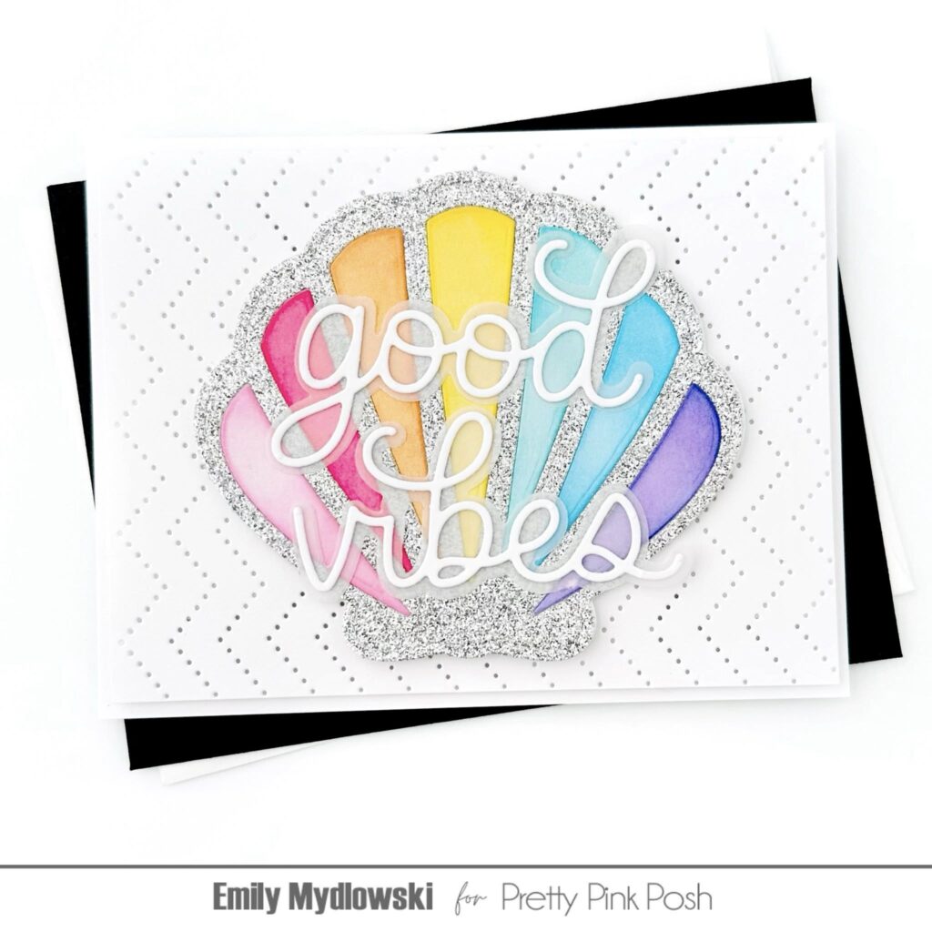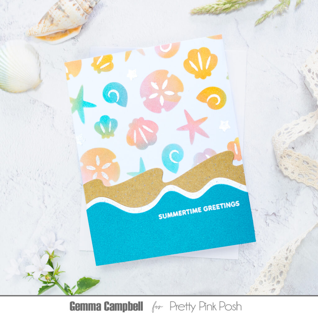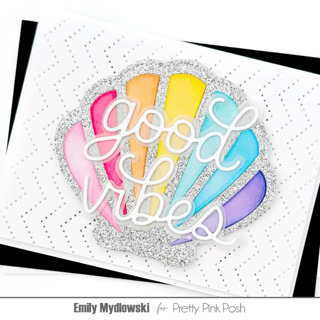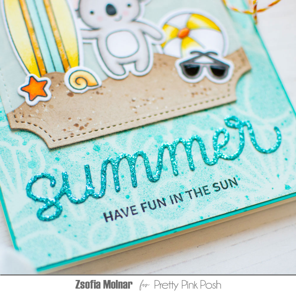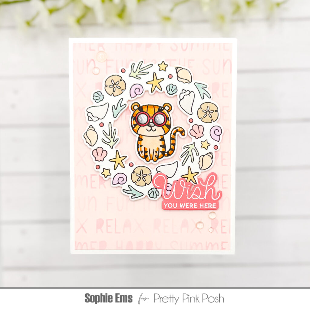 To create a vibrant backdrop, I ink blended a colorful summer palette, then layered over it with the Summer Words stencil and shimmer relief paste for some sparkle and texture.