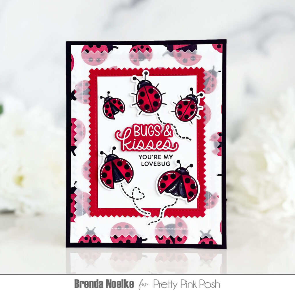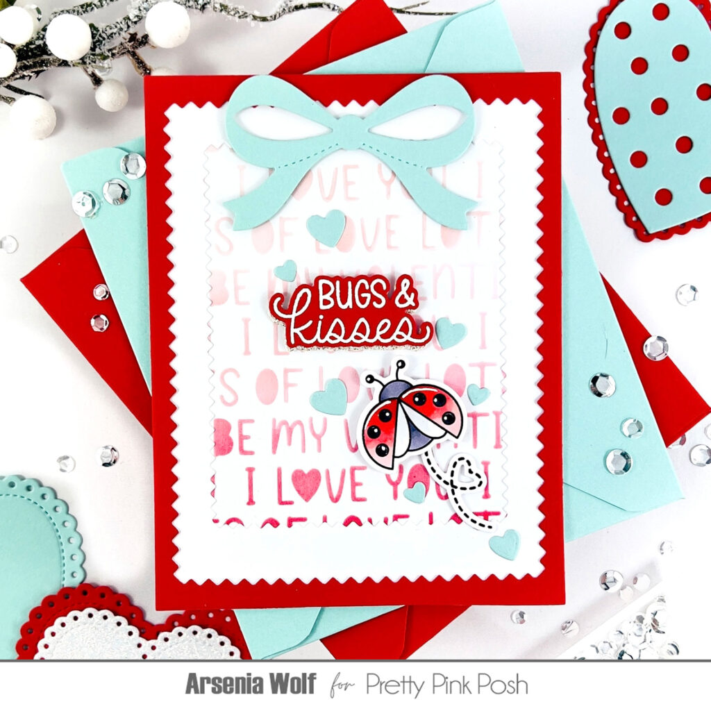 For card number two, I inked up a background with the new Layered Cupid Items Stencil—friends, this one is an instant favorite! I brought back more adorable images from the Lovely Ladybugs set and gave them a cozy resting spot using an oldie-but-goodie: the Eyelet Hearts Dies.
