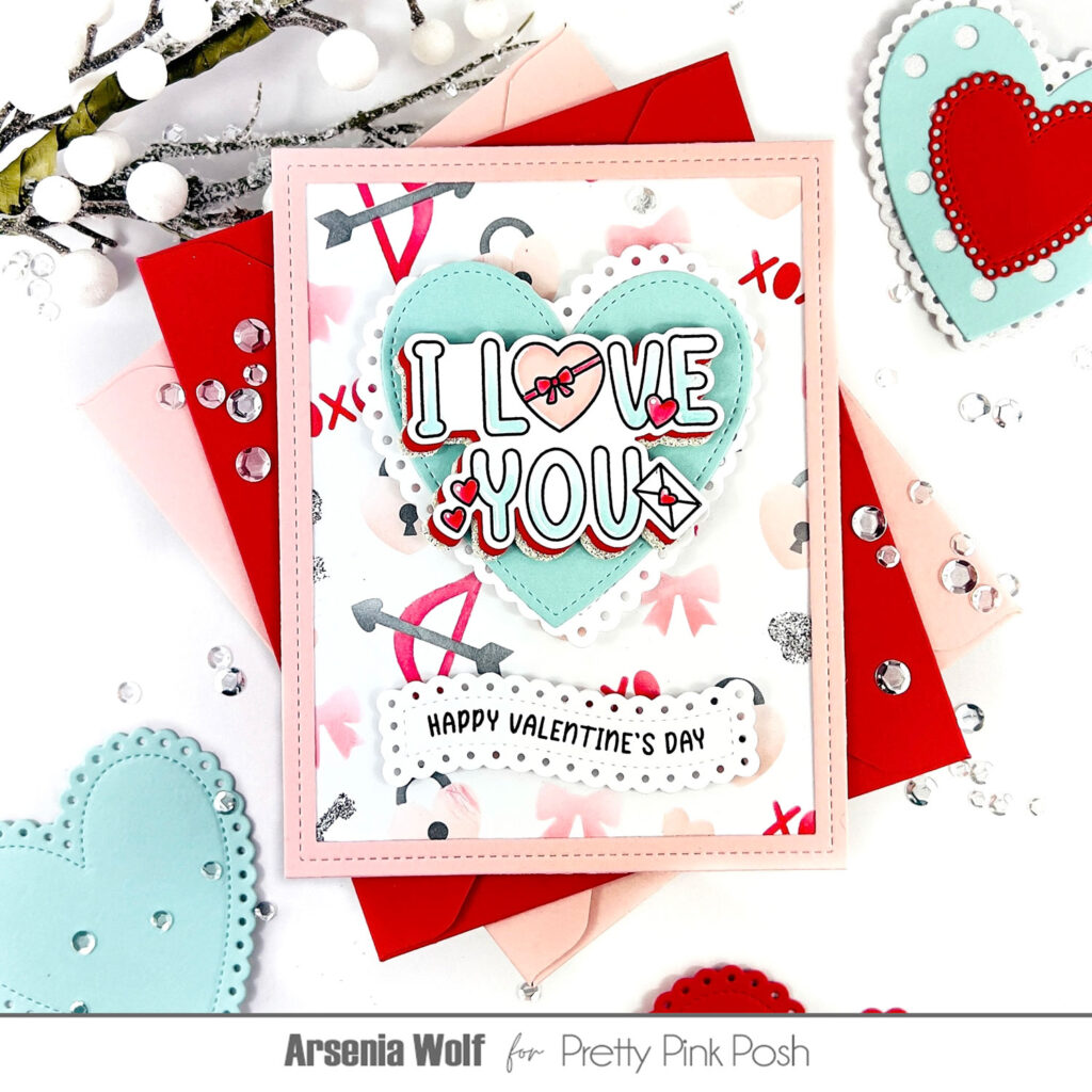 For my third card (yes, still loving it!), I used the Layered Cupid Items Stencil again—told you it was a favorite! I stamped, colored, and die cut an image from the new Valentine Word Scenes set and stacked it up with red and glitter cardstock for some extra sparkle.