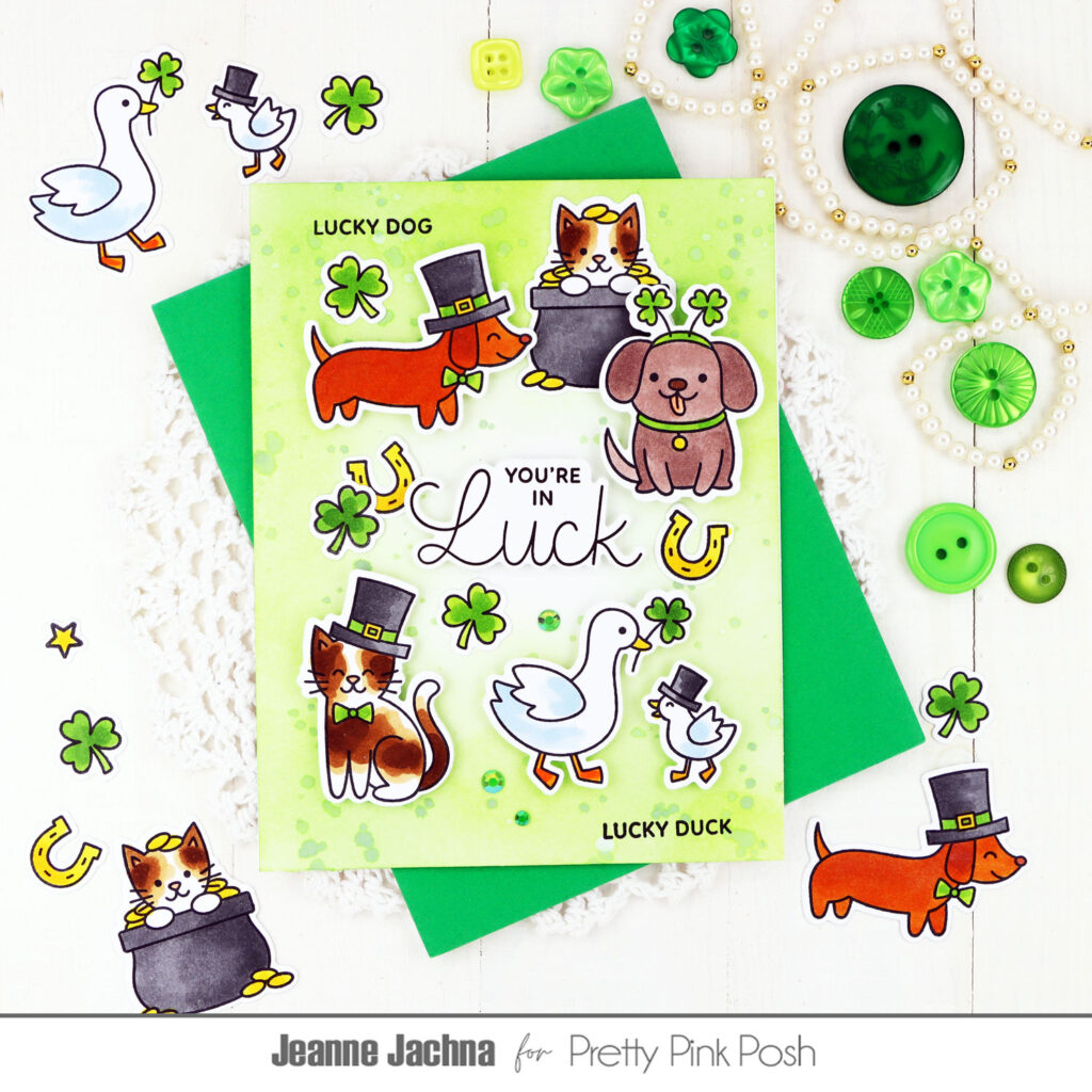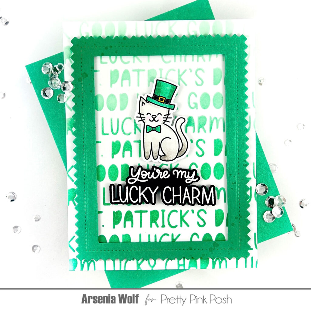And now for the bonus card! I couldn’t resist the new Lucky Animals Stamp Set with coordinating dies—this kitty is guaranteed to send all the lucky vibes. That shamrock hat? Too cute!