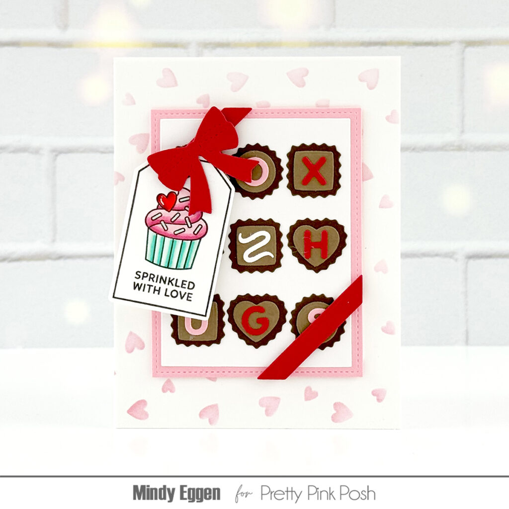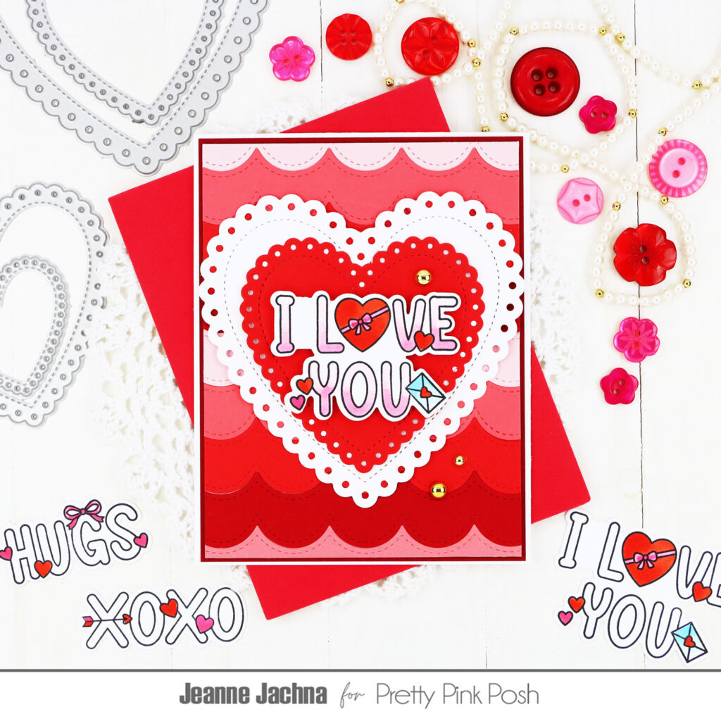 Since the background was nice and busy, I gave my image a place to shine using the Stitched Hearts Die Set and Eyelet Heart Dies. I added a sub-sentiment from the new Valentine Banner Greetings Stamp Set with the Banner Greetings 2 Die Set, then finished everything off with a frame from the Fancy Cake Die Set. Card three is complete, and I’m obsessed with the dimension—these word scene sets are definitely a favorite!